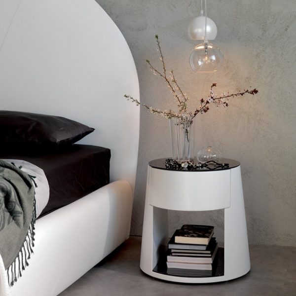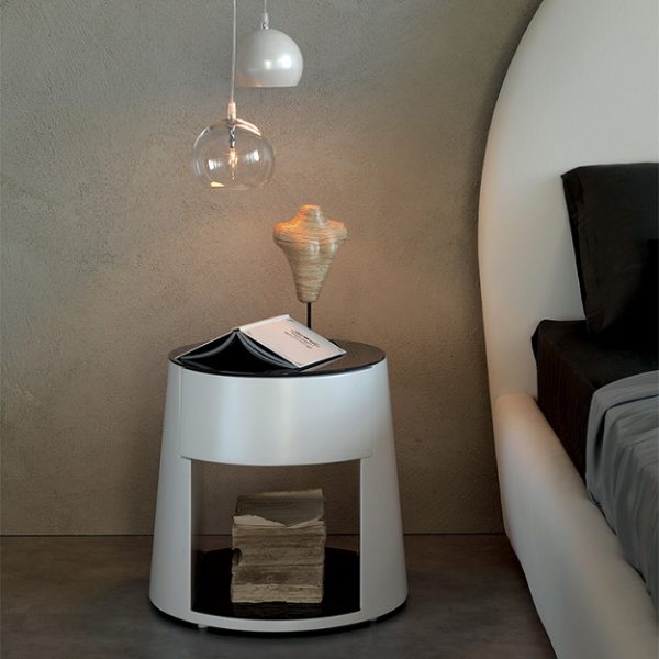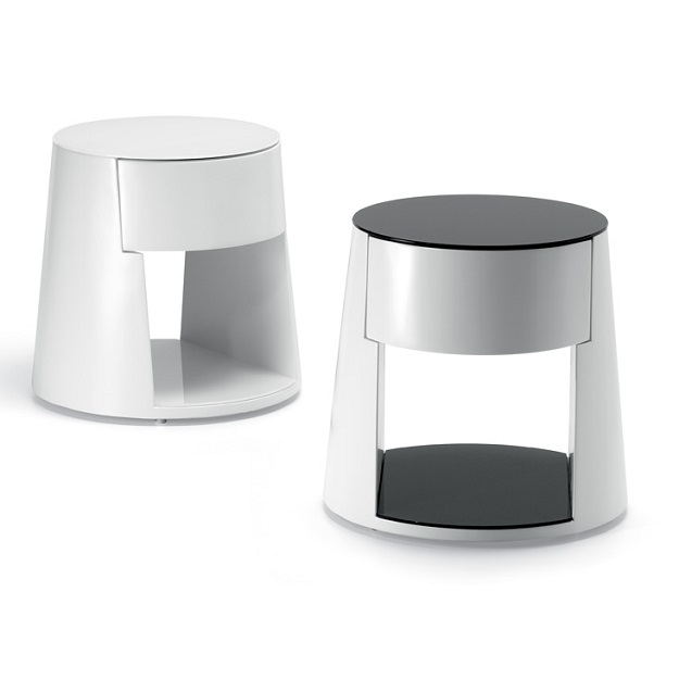 The Cattelan Nigel Bedside Table is a stylish nightstand featuring a tapered cylindrical polyurethane silhouette with drawer in white, with a 5mm thick tempered glass top in a transparent extra clear or graphite finish. The design is completed by an open storage space with a matching tempered glass surface.