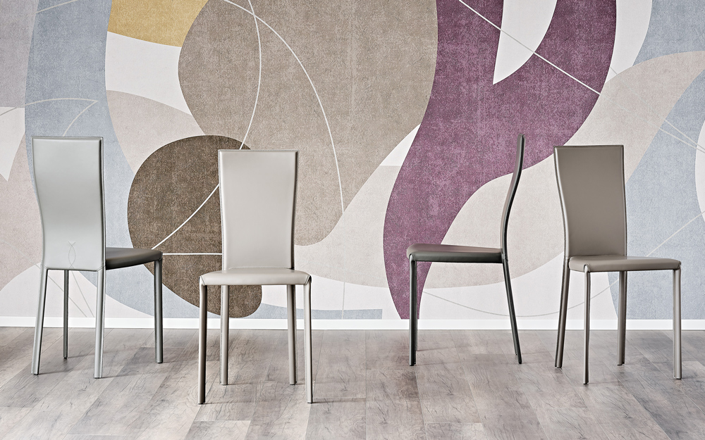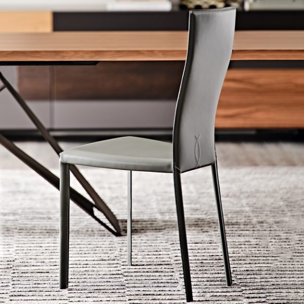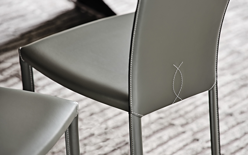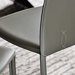 The Nina is a slimline leather upholstered chair with a gentle curved back and interlocking stitch detail centred on the lower edge of the back rest. Available in two sizes
