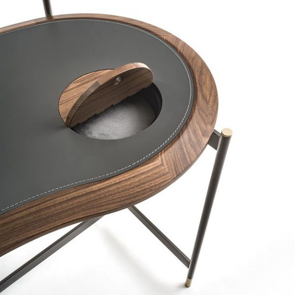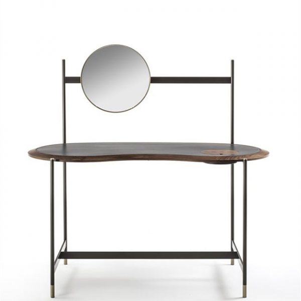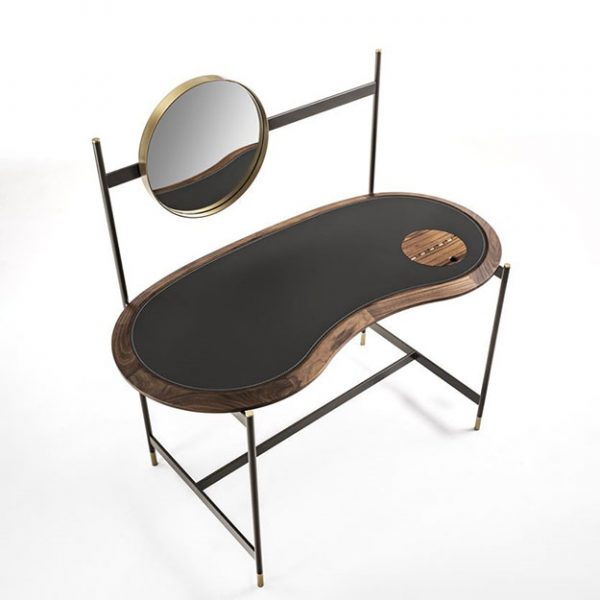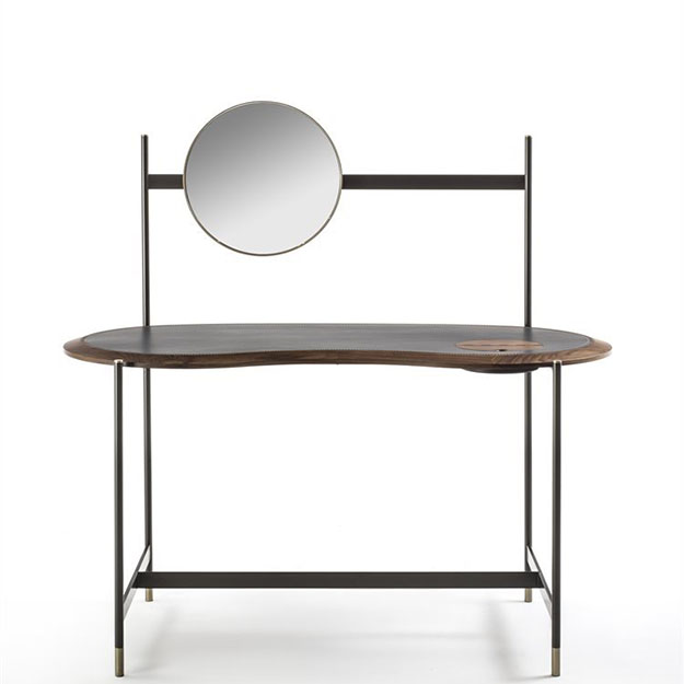 The Porada Ninfea is a stylish contemporary dressing table with a kidney shaped solid Canaletto walnut top inlayed with regenerated hide leather and a small round storage compartment to the right.
