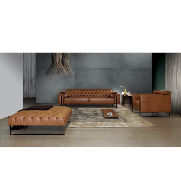 The tufted manufacturing also describes the seat of the ottoman, supported by linear feet that give it great weight.