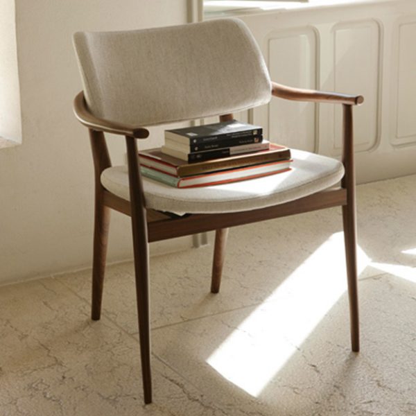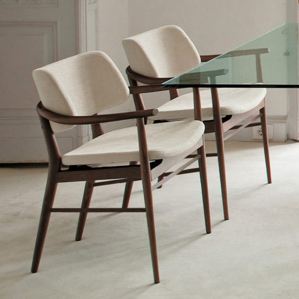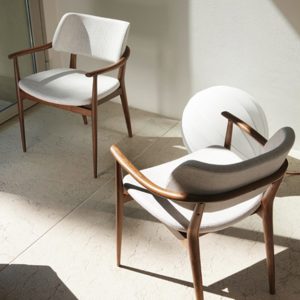 The Nissa is a classic dining chair featuring a solid wood frame and armrests and a gently curving back for added support. The upholstered seat and backrest can be selected in an array of fabric or leather finishes.