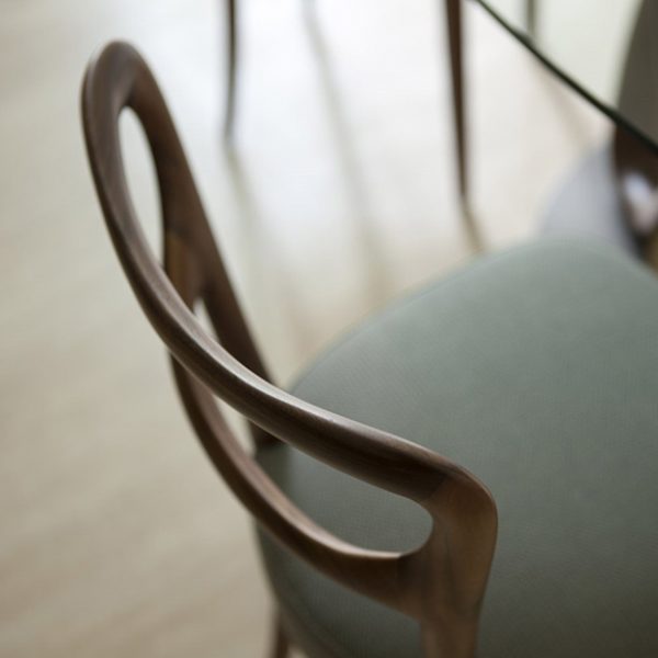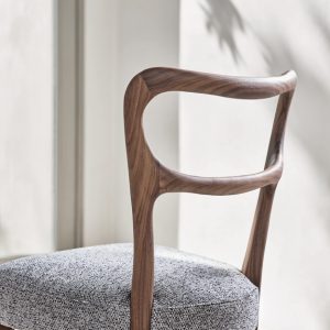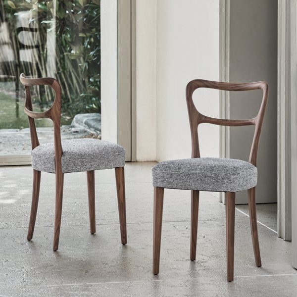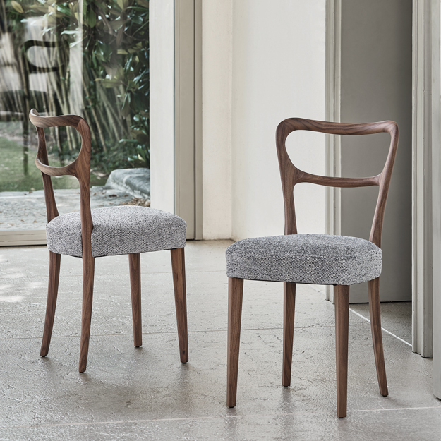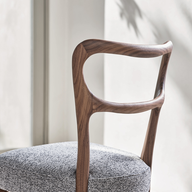 The Noemi is a classic dining chair design featuring a delicate carved solid Canaletto walnut back with cutout detailing leaving a mid-level bar for additional back support.