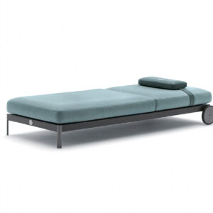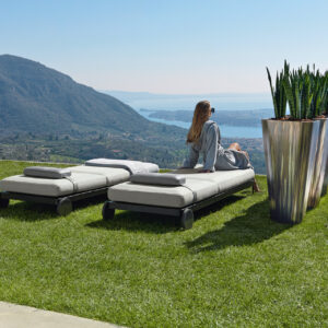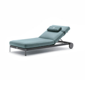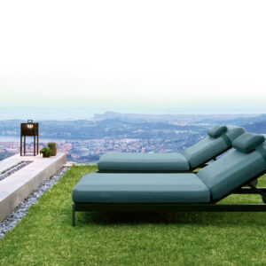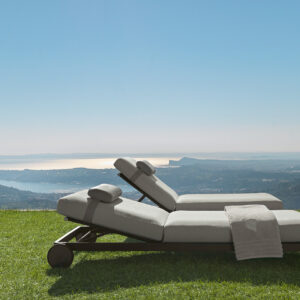 Outdoor sunbed available in special treated fabric or first grade leather. Headrest with embroidered Giorgio Collection logo. Structure in satined black metal with inserted Giorgio Collection logo and adjustable inclination.