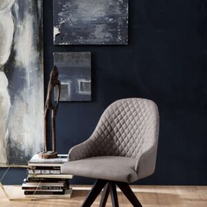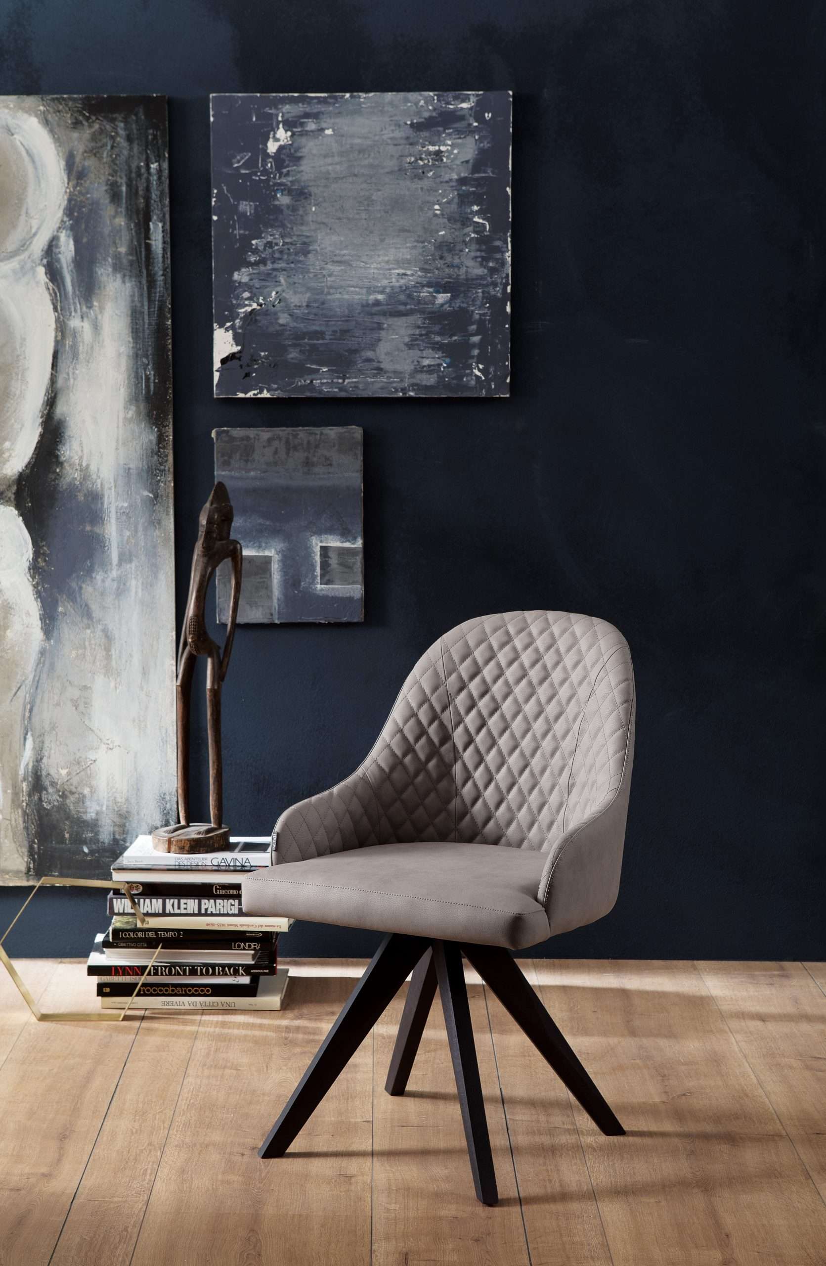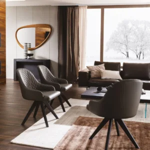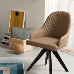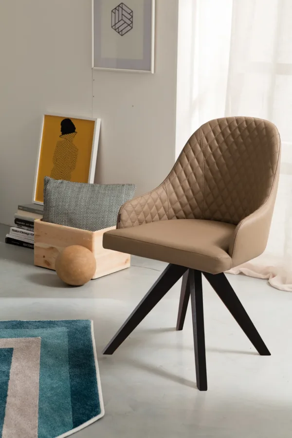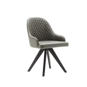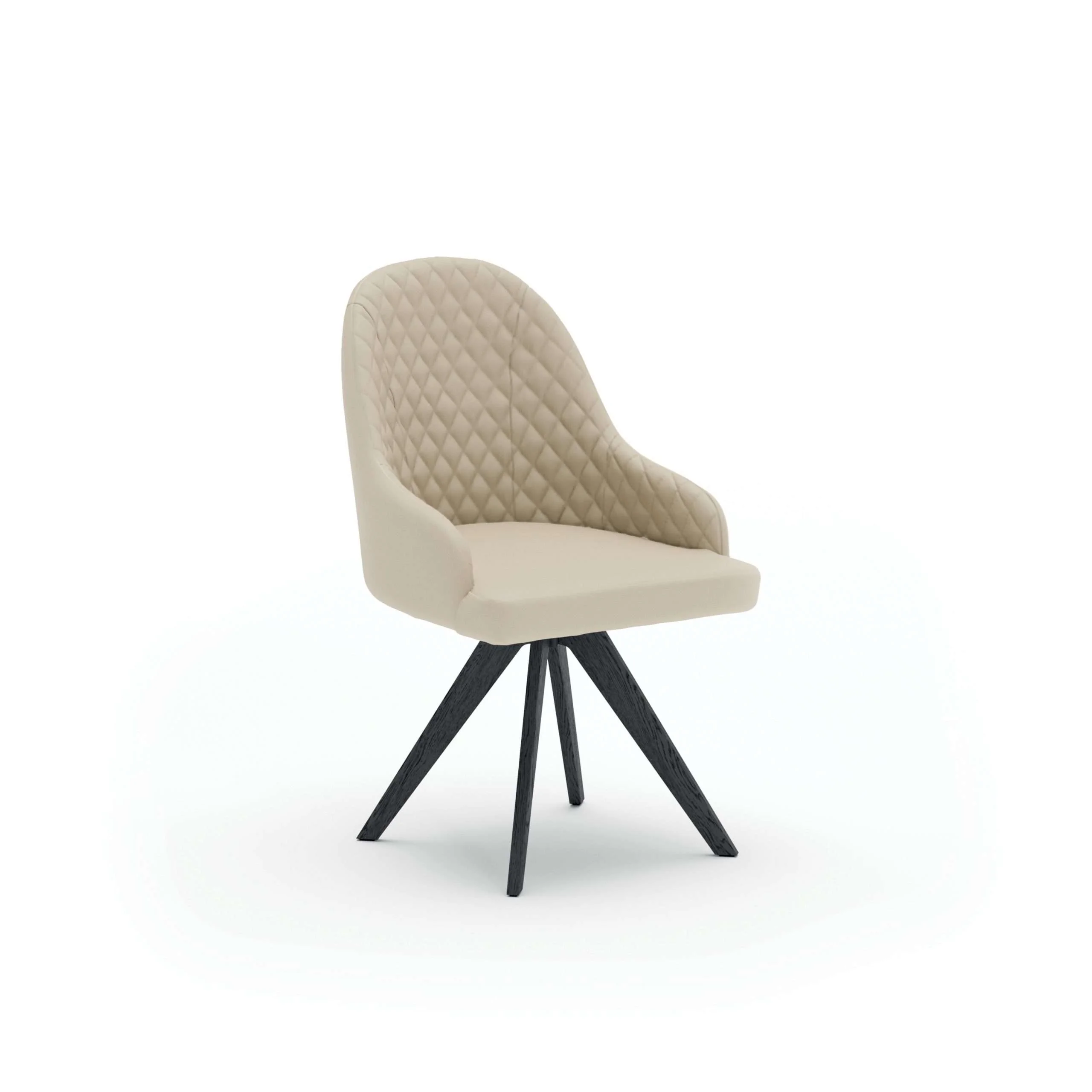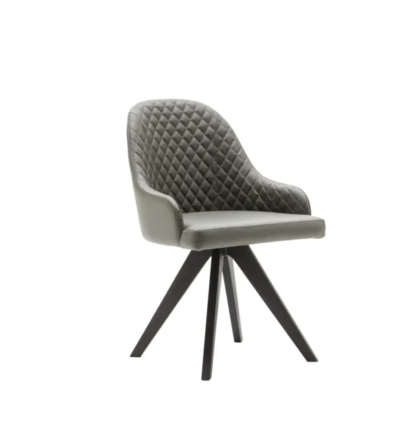 Fully upholstered chair with armrests in various finishes, quilted backrest interior. Dyed beech structure.