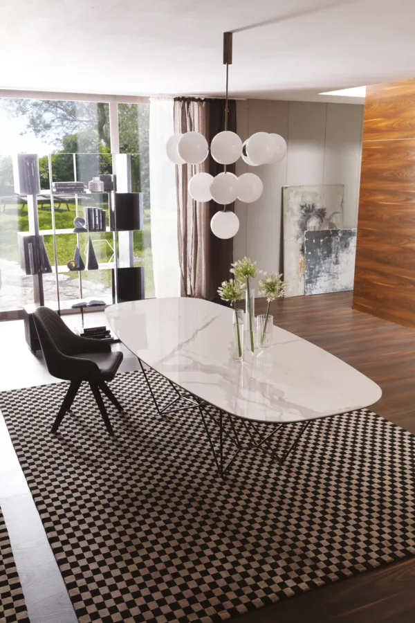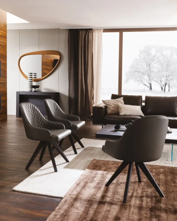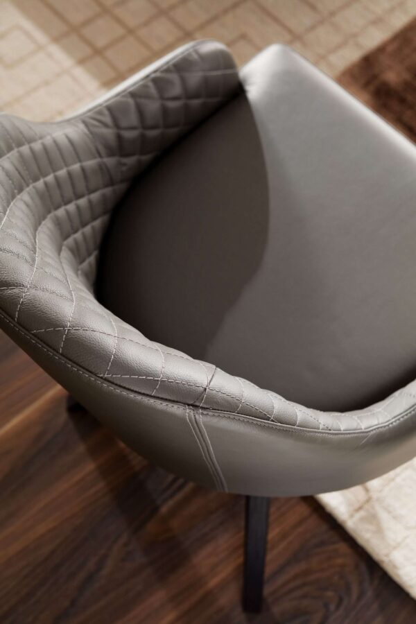 Design elements capable of provoking a pleasant sensory contrast, thanks to the union of the delicate finishes of the seat and the slender structure of the base. Contemporaneity and perfection of proportions define its character, its ability to be durable against trends alternation.