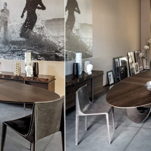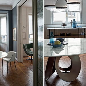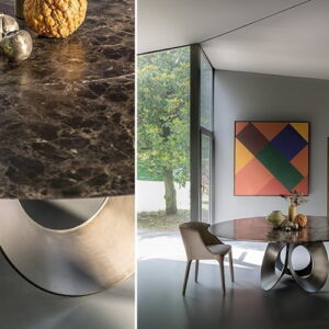 The base is a complex piece of manufacturing, three metallic circles that meet at different angles proving that elegance can be art and that luxury can push boundaries; it is interior engineering that looks as stunning as it is thoughtful. Whilst the base is available in micaceous brown, brass, titanium and oxy grey, the top is cut to a circular shape or oval and it is available in moka oak or sucupira and Emperador marble or Niveo White marble with the rotating tray Lazy Susan, which is perfectly integrated in the table.