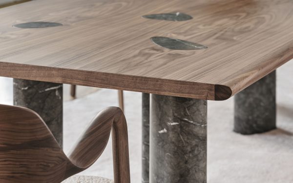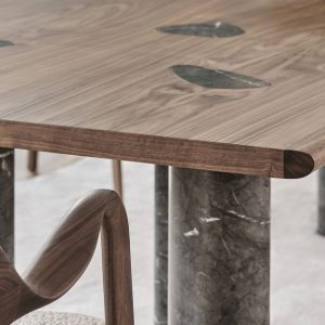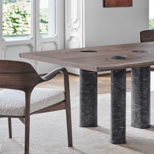 The canaletto walnut table top is finished with marble inserts to match the legs, creating the illusion that the legs have continued through to the top surface.