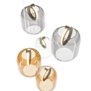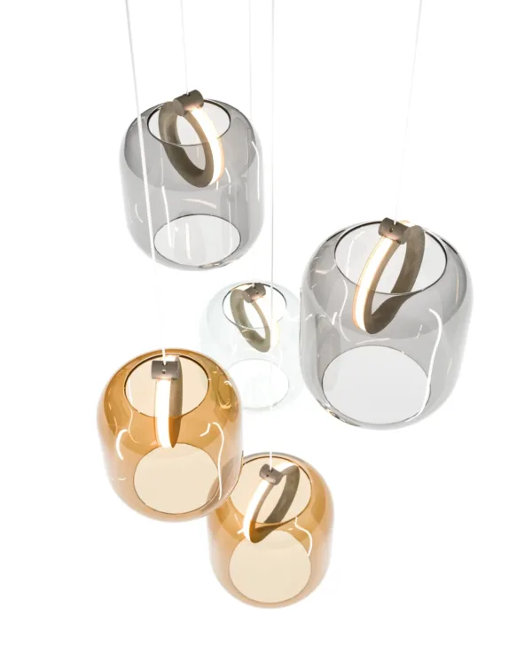 Chandelier with metal lamp body and blown glass lampshades in three colours. Available in different configurations.