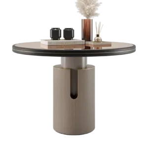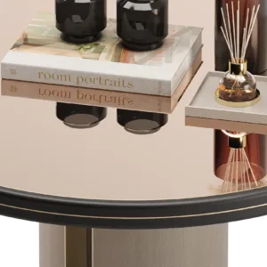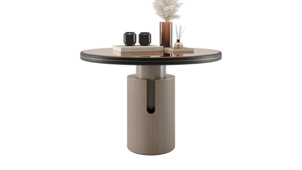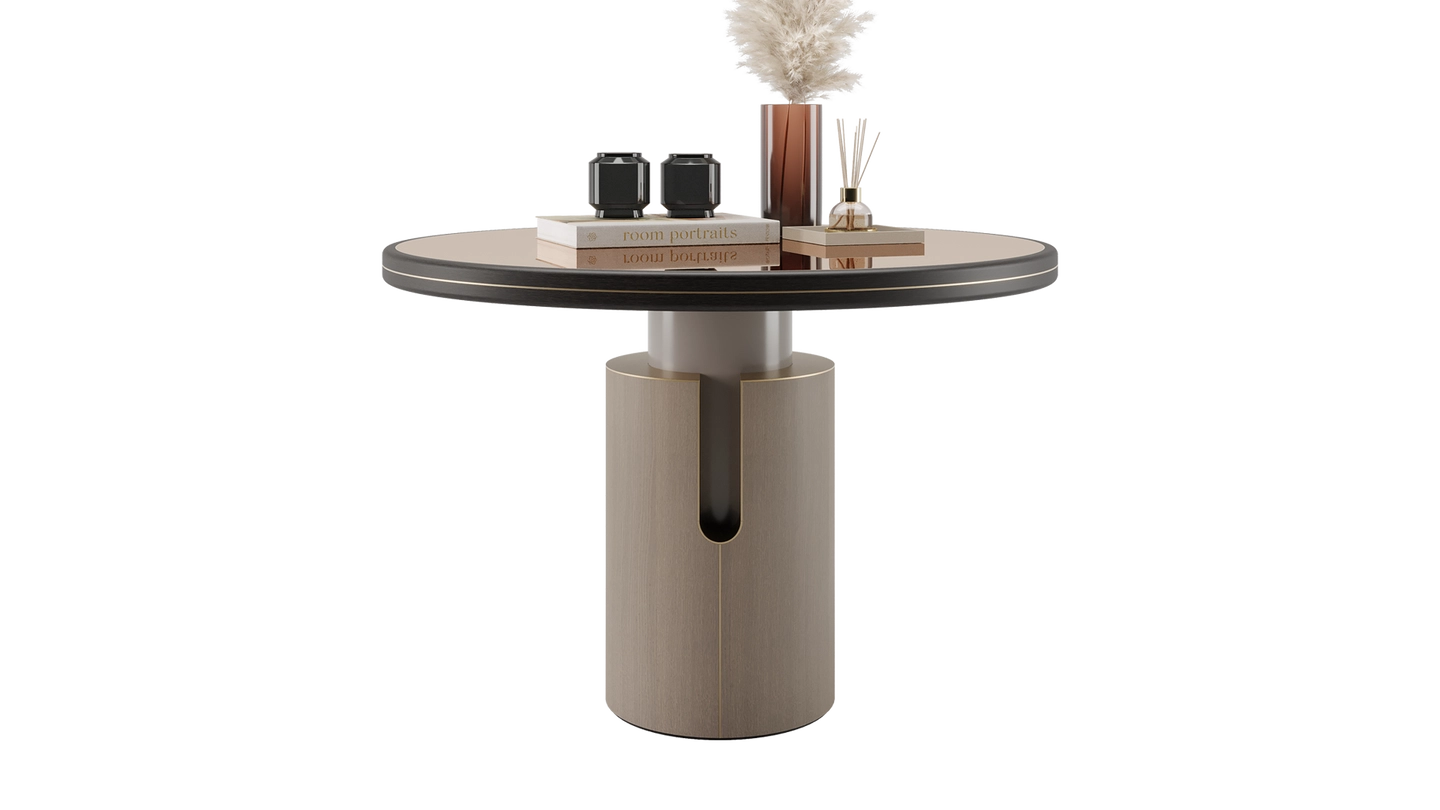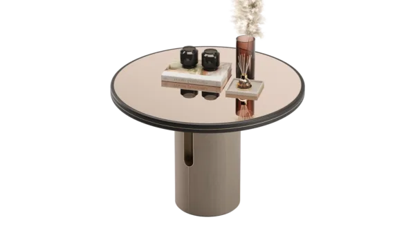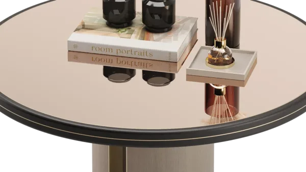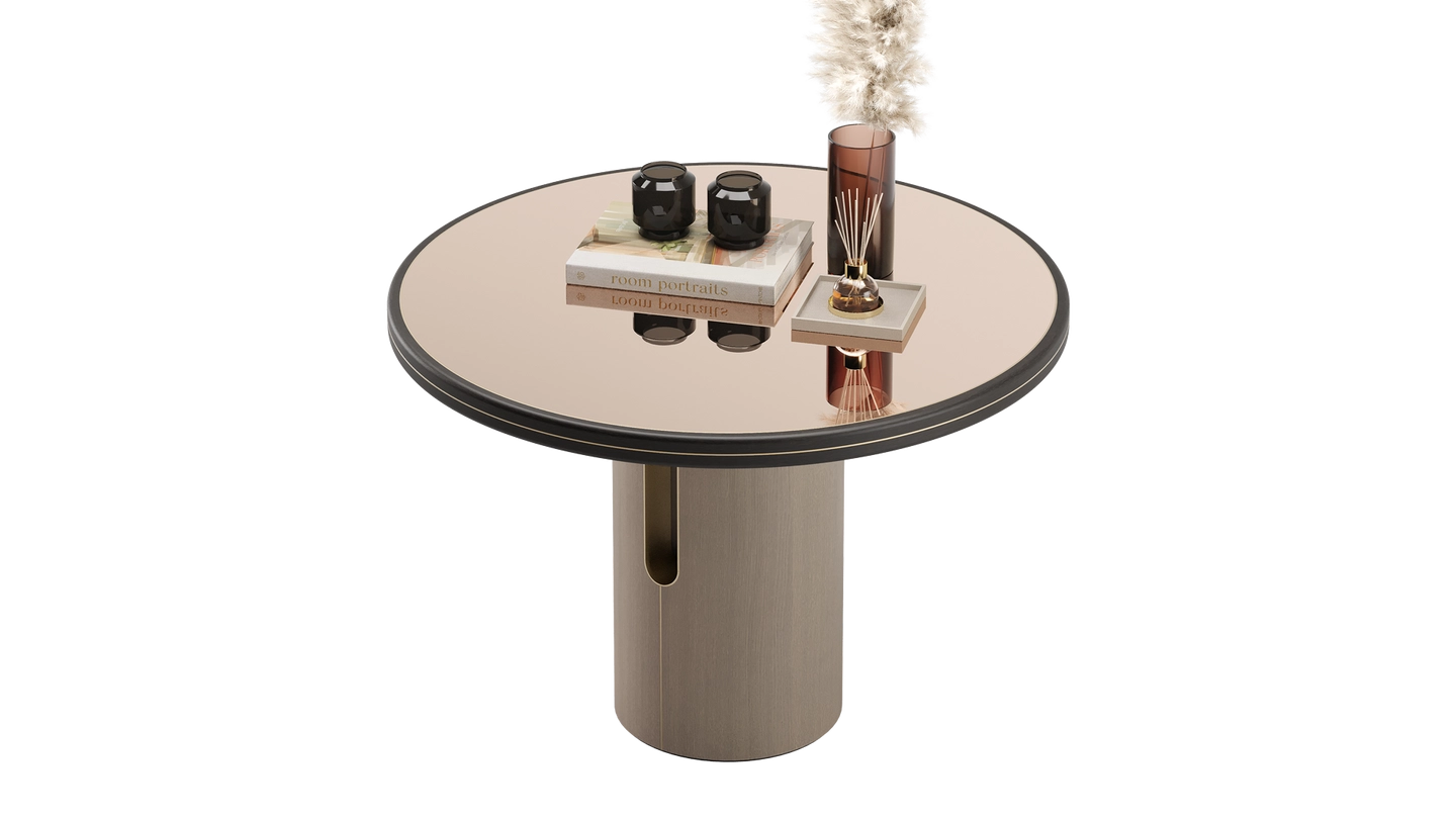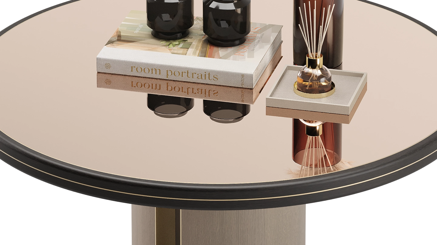 Featuring a simple-yet-sculptural silhouette, the wood veneer PASADENA pedestal table’s profile is elevated with a stepped, cut-out base that adds interest below, while the surface is inlaid with bronze mirror, artfully reflecting any pieces displayed on top.