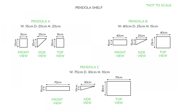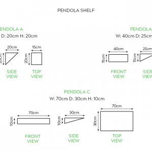 | Size | Pendola A – W: 15cm D: 20cm H: 20cm, Pendola B – W: 40cm D: 25cm H: 15cm, Pendola C – W: 70cm D: 30cm H: 10cm |