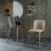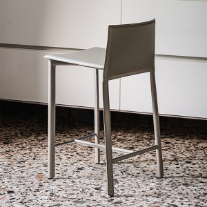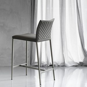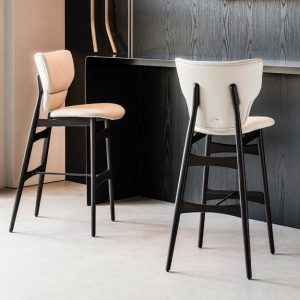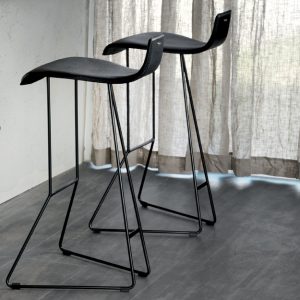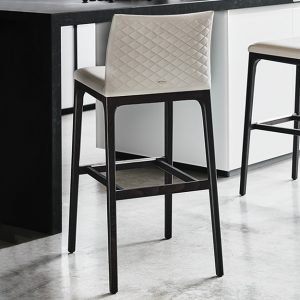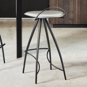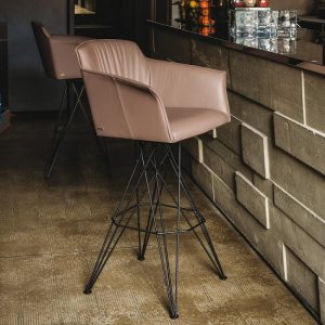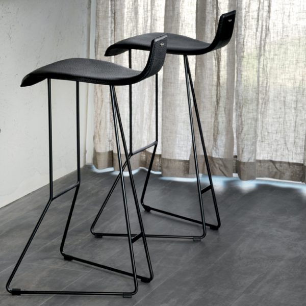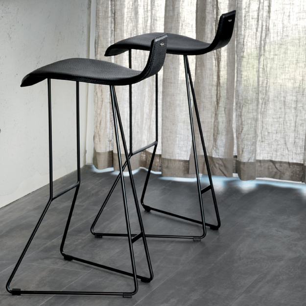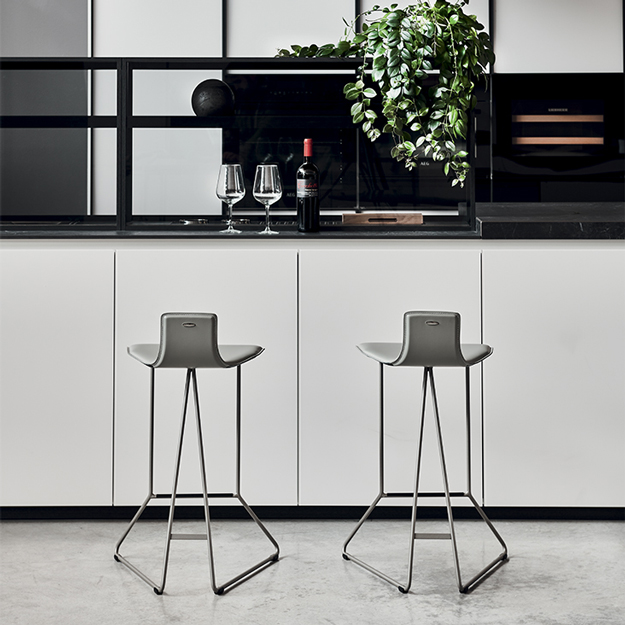 The Pepe is a statement bar stool with a slender lacquered metal finish base. This is complemented with an upholstered leather seat with a minimalist curved tapered backrest in a choice of colours, with optional contrast stitching.
