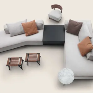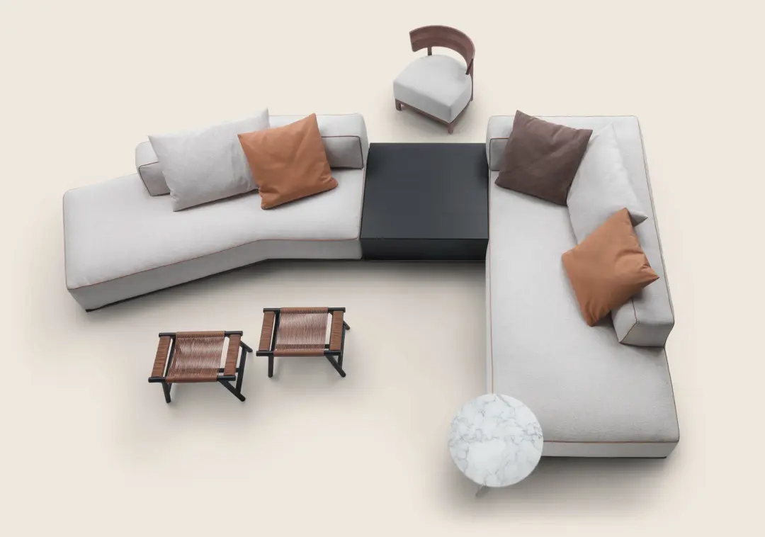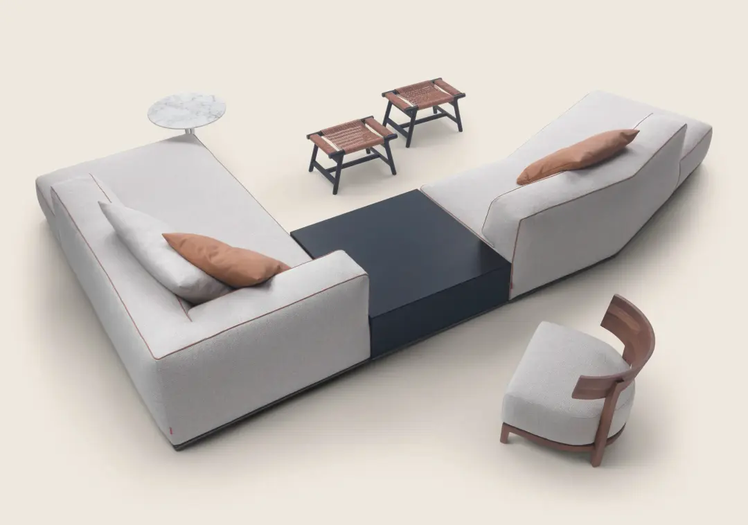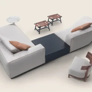 The Perry seating system also includes a minimalist coffee table in wood that can be integrated into furniture arrangements or used by itself as a complement to other sofas in the collection.