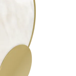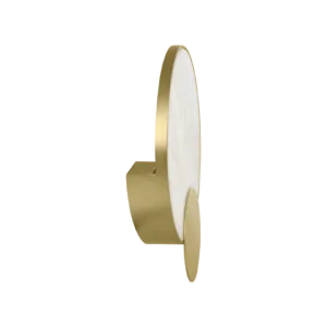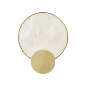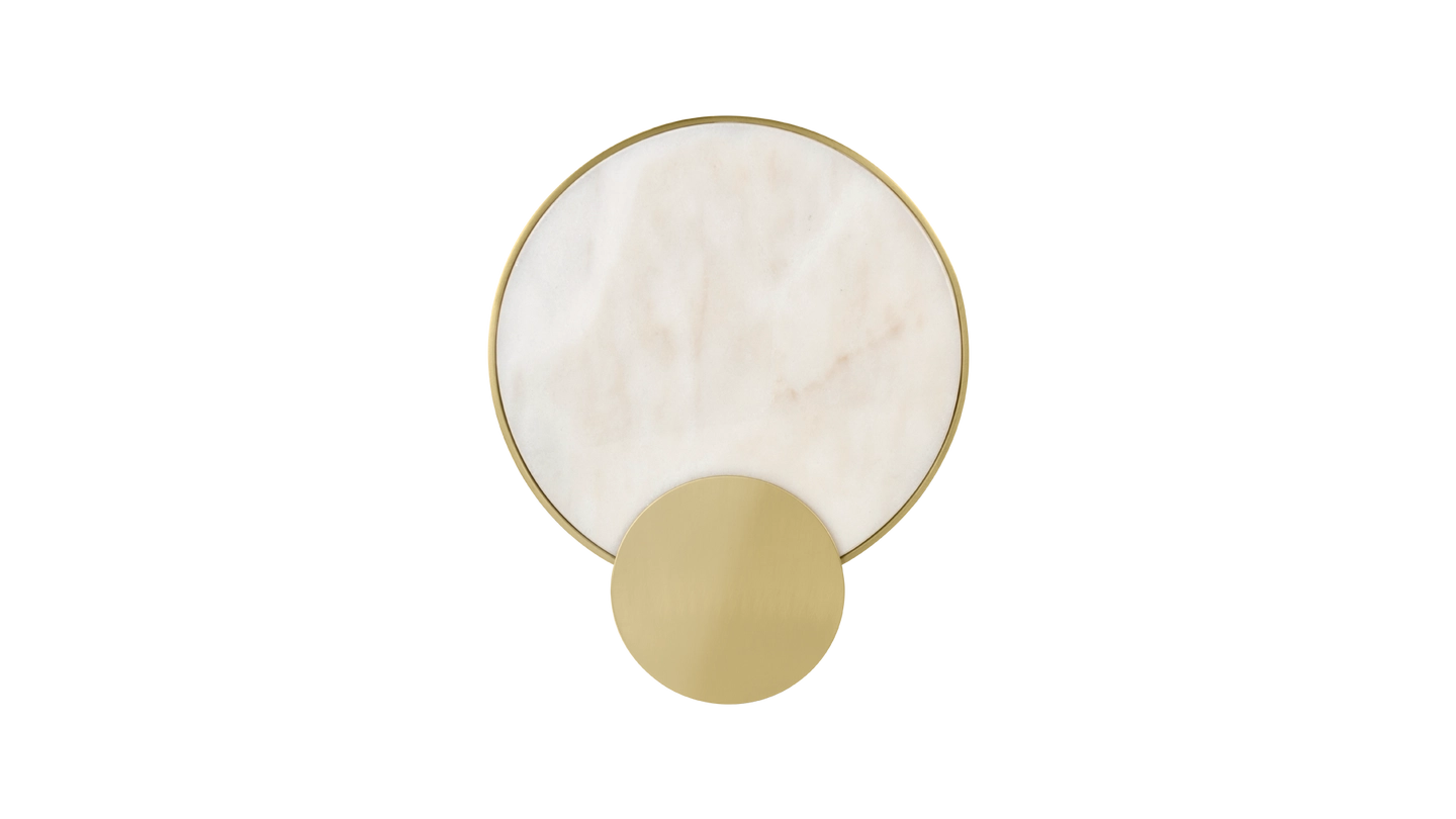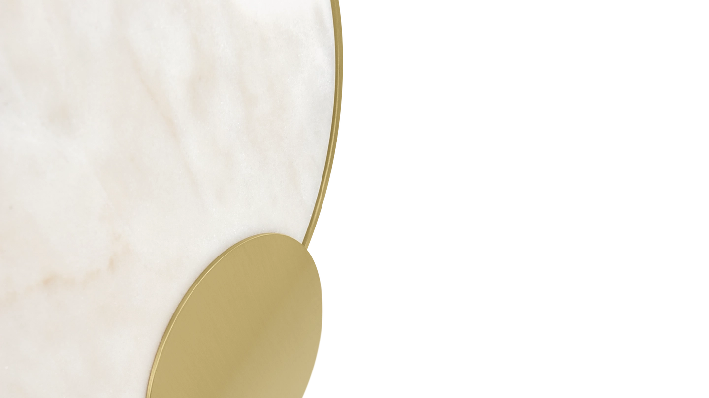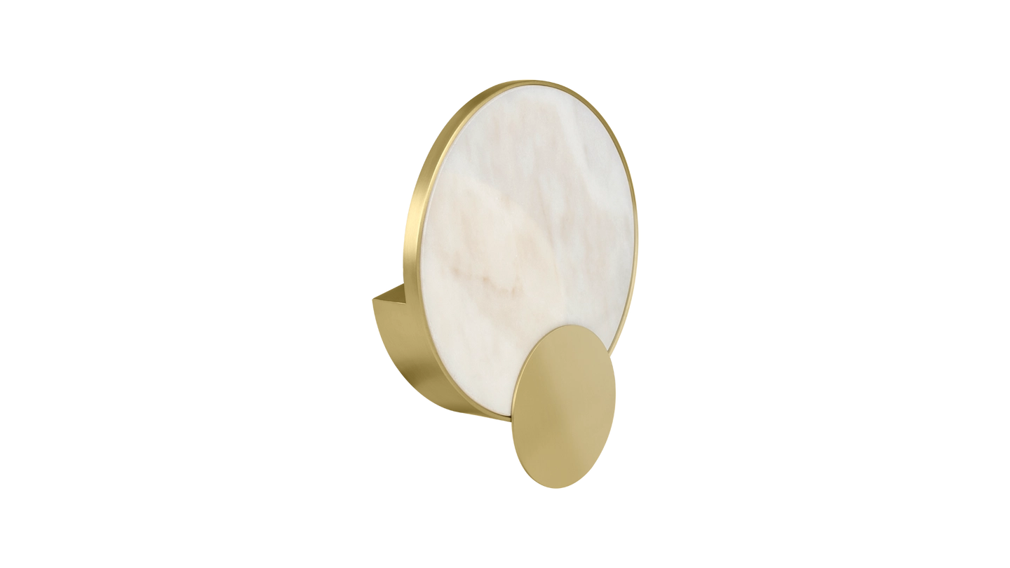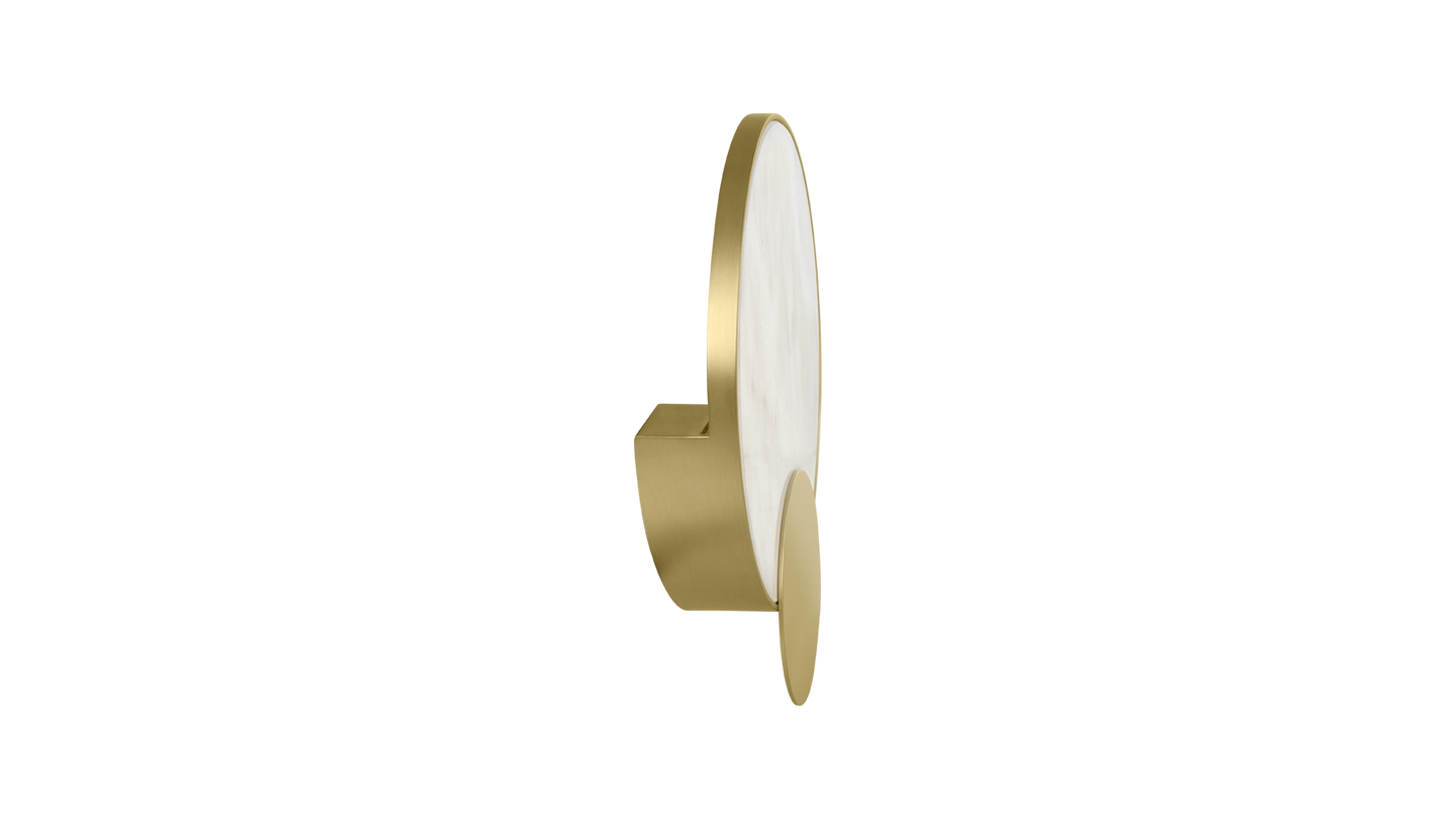 Warm veined stone and brushed brass combine in our PETRA Wall Lamp, where overlapping discs create a subtle geometric design that casts an atmospheric glow.