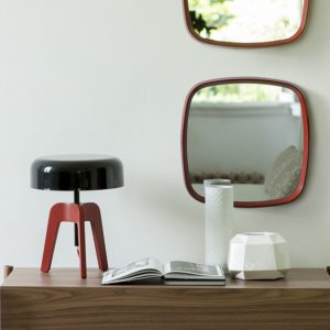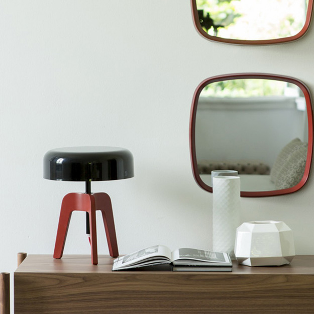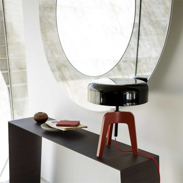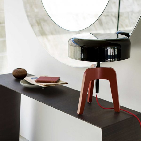 The Pileo is a slender tripod-shaped table lamp. Its elegant canaletto walnut or ash finish frame is complemented with a dome-shaped lacquered tin-plated shade in a choice of finishes.