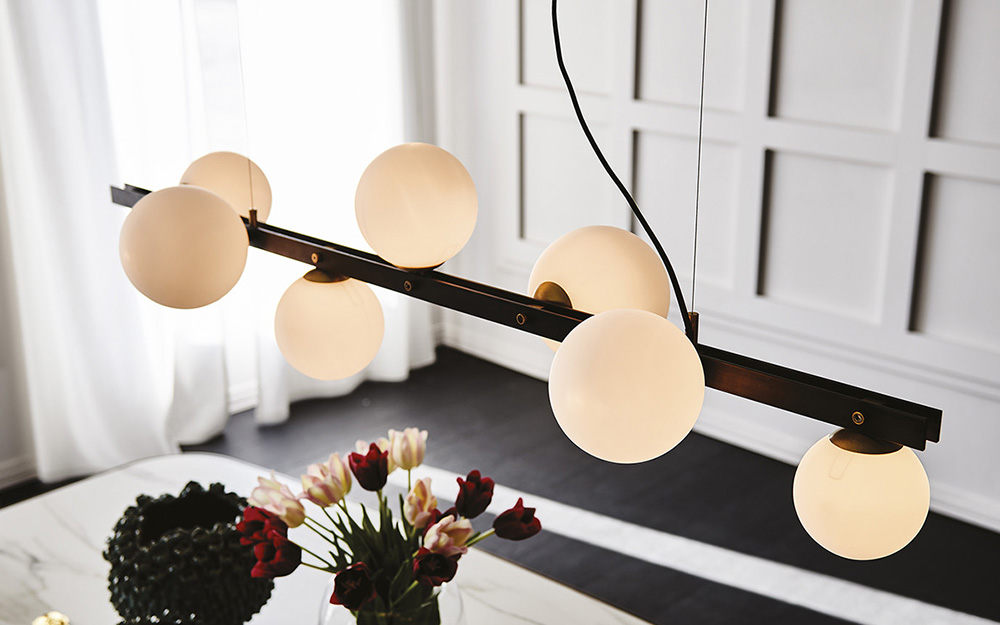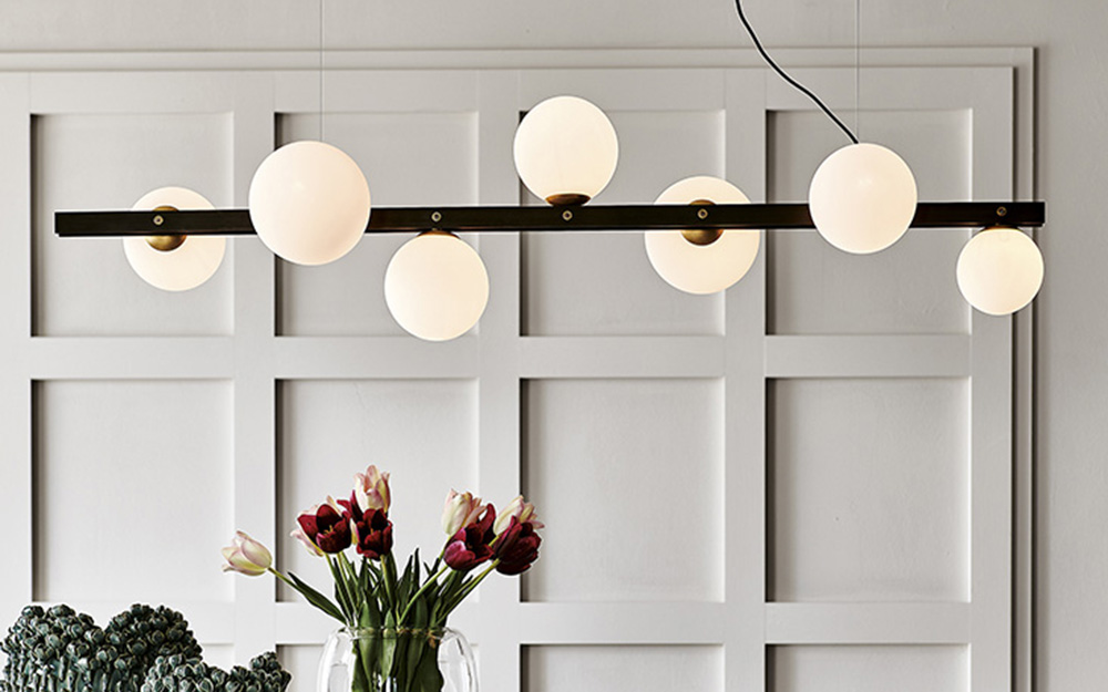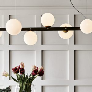 Elegant and sleek, the Planeta Suspension Light features seven handblown bulbs in a satin white glass finish positioned on a linear frame in burnished steel. The frame is complemented with brushed brass detailing for a sophisticated finish.