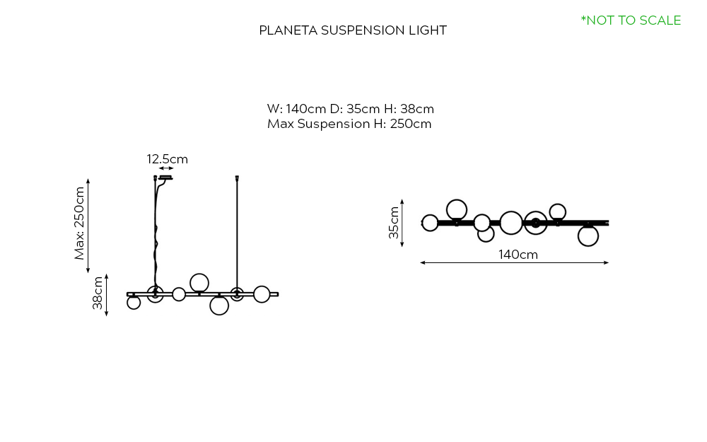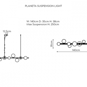 W: 140cm D: 35cm H: 38cm, Max Suspension H: 250cm