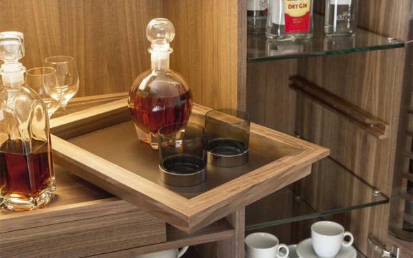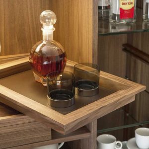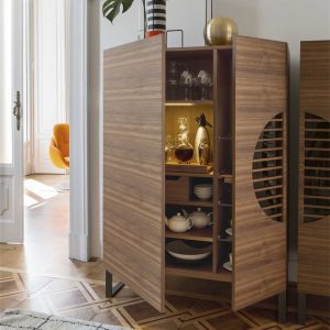 A contemporary bar cabinet with solid Canaletto Walnut frame with built-in LED storage, pull-out board, drawer, wooden tray and glass and wooden shelves. The handle is carved into the upper part of the door. The Polifemo is available with either a right- or left-hand opening, and the legs comes in a Grey Pewter finish.