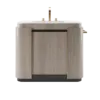 Petite polished-steel feet and soft curves add a lightness to the body of the POSITANO vanity unit, which provides liberal countertop space and generous cupboard storage accessed via double doors.