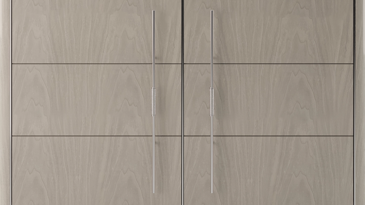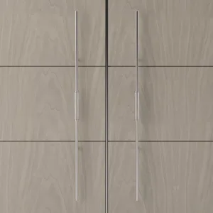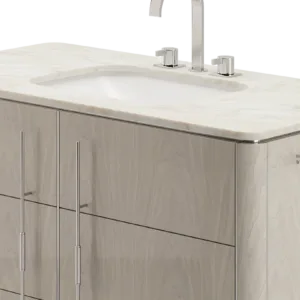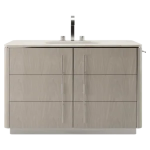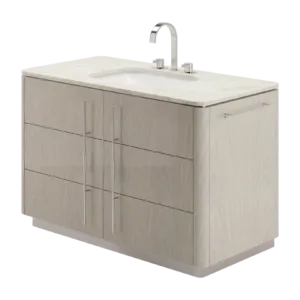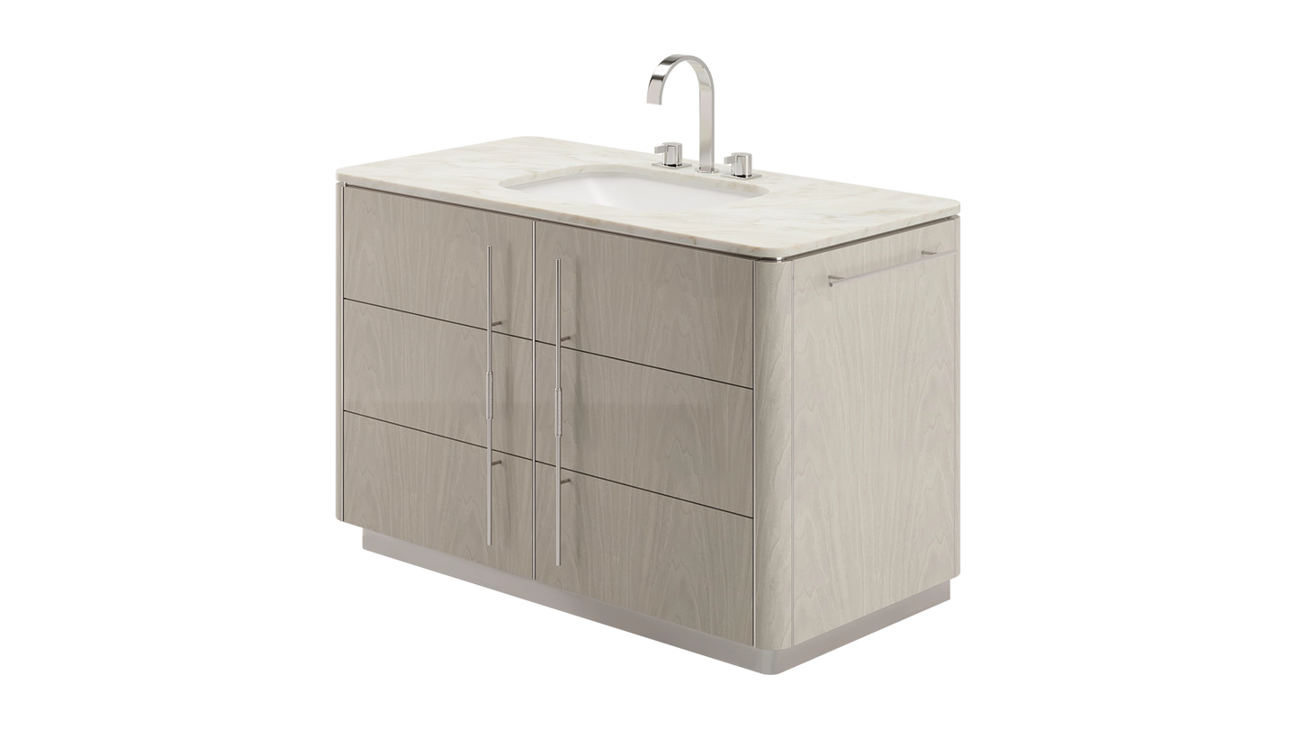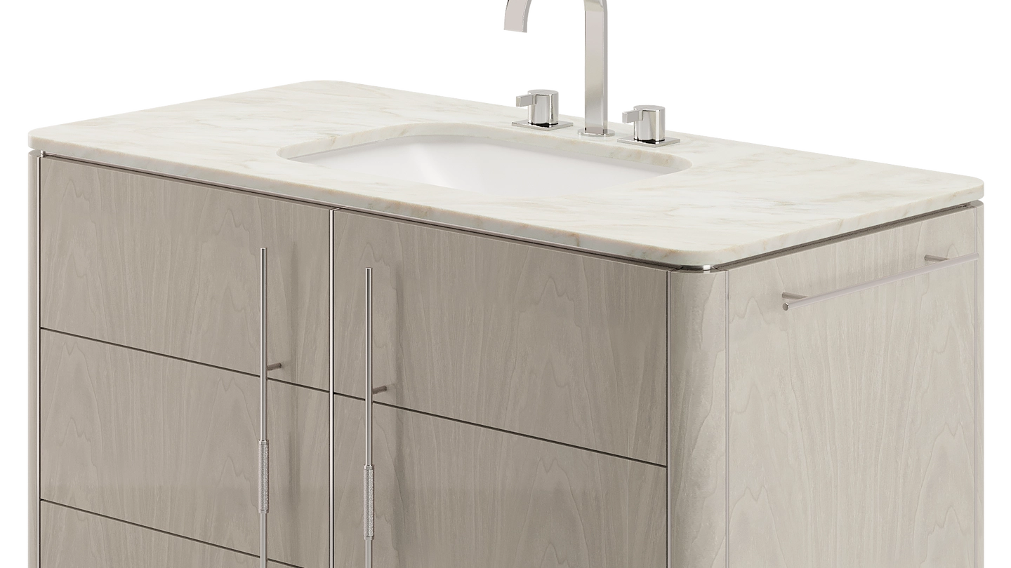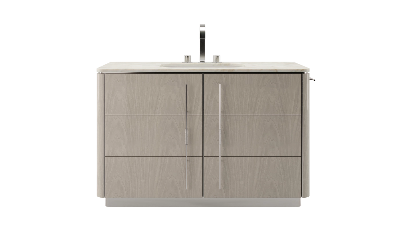 Petite polished-steel feet and soft curves add a lightness to the body of the POSITANO vanity unit, which provides liberal countertop space and generous cupboard storage accessed via double doors.