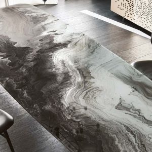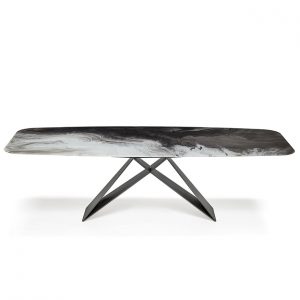 The Premier CrystalArt Dining Table is a striking design featuring an intersecting angular lacquered steel base with cutout detail and a CrystalArt decorative glass top in a range of rectangular and rounded rectangular sizes. Available in a selection of embossed lacquered finishes for the base, with a choice of CrystalArt design for the top.