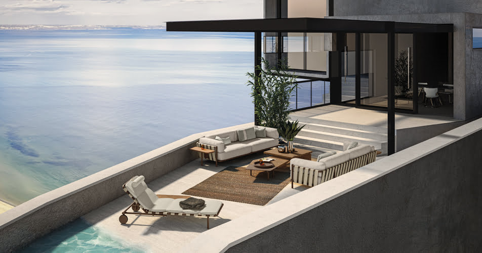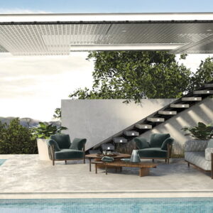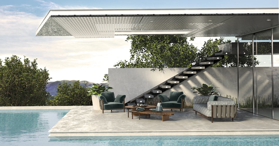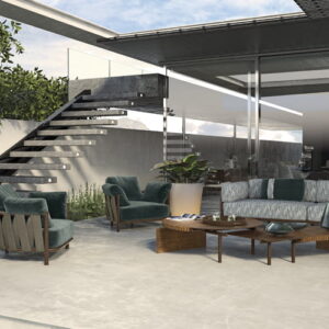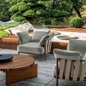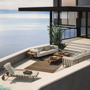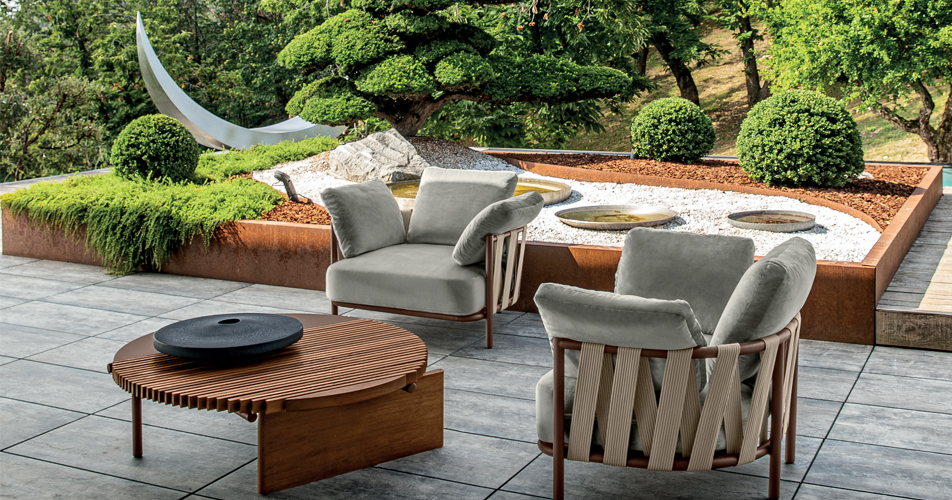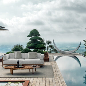 The Punta Ala outdoor sofa, characterized by its enveloping and rigorous elementary geometric shapes, has a fundamental structure in metal, conceived as a delicate and sturdy basket that serves to accommodate supple cushions, which convey a feeling of pleasurable relaxation.