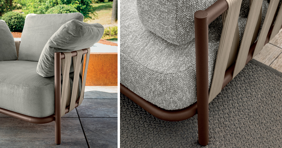 Punta Ala emphasizes the juxtaposition between the rigid tubular lines of the load-bearing shell and the simple, soft volumes of the seating area, employing a lexicon of compositional purity that yields a sofa of nimble and airy conception. The elaborate weave and warp of the straps, unique in this genre, establishes its own aesthetic leitmotif.