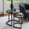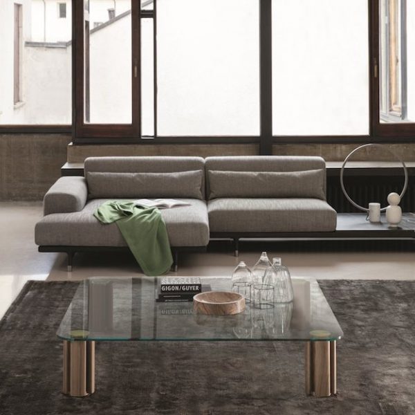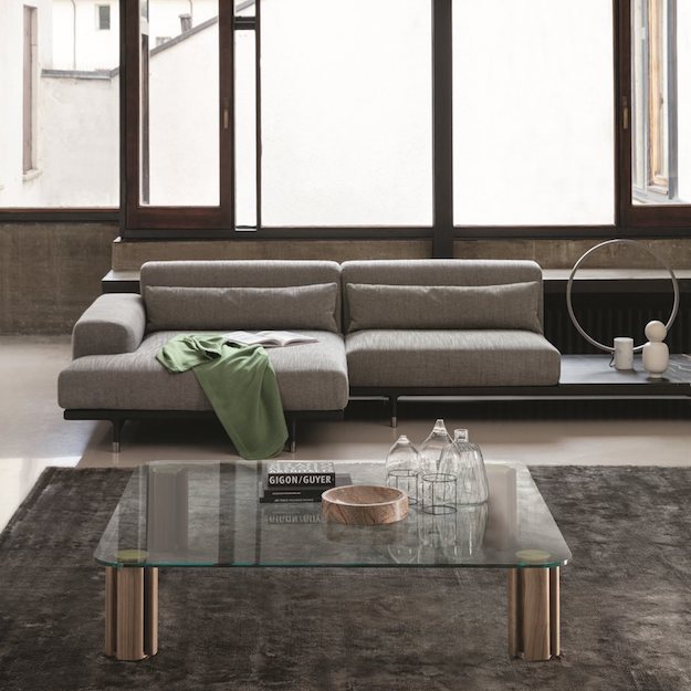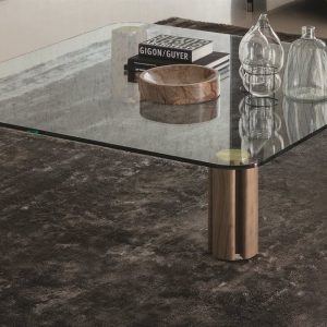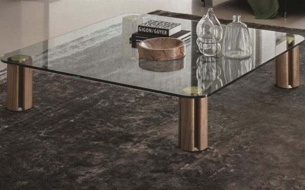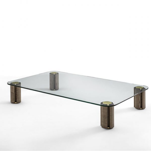 The Porada Quadrifoglio Coffee Table features a clear glass top in a choice of round-cornered square or rectangular sizes. The table top is supported by solid wood legs at each corner, available in a range of finishes with stylish brushed brass top plates and feet.