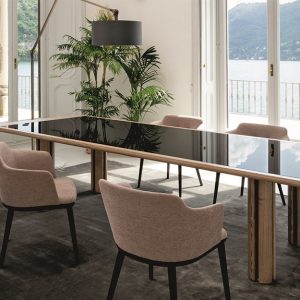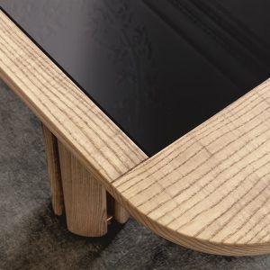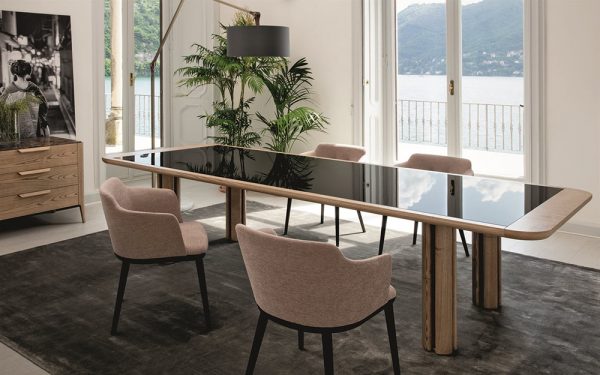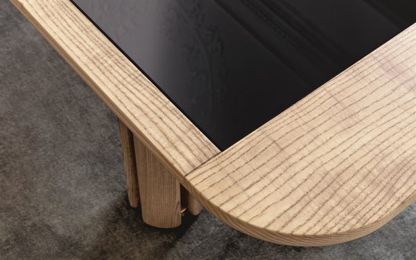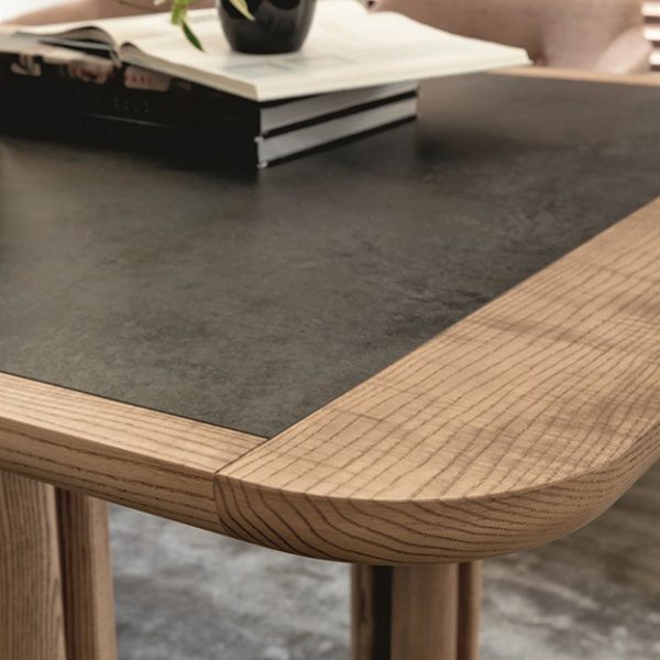 The Quadrifoglio Rock table features a striking top in glass or a selection of Rock Laminated Porcelain finishes with a solid ash border that runs around the edges.