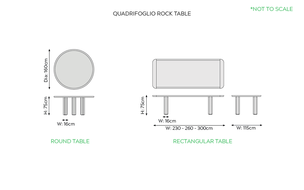 Size | Rectangular – W: 230cm D: 115cm H: 75cm, Rectangular – W: 260cm D: 115cm H: 75cm, Rectangular – W: 300cm D: 115cm H: 75cm, Round – Dia: 160cm H: 75cm |