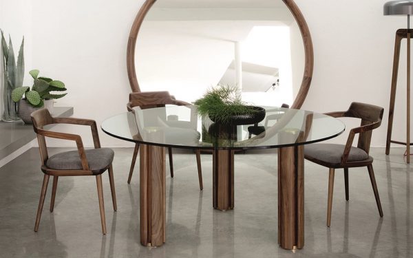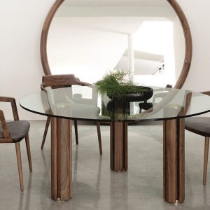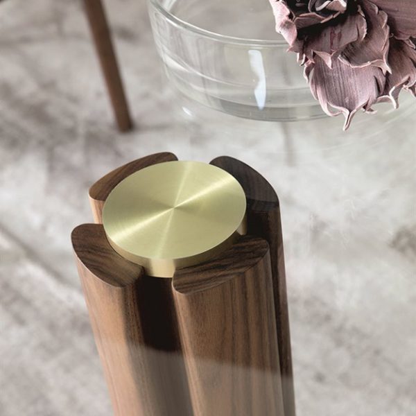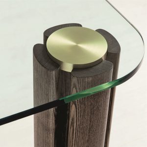 The contemporary Quadrifoglio table features a 15mm transparent clear glass top in a variety of shapes and sizes. The table top is complemented by solid wood legs in a range of finishes with stylish brushed brass plates and feet (please note image six for the placement of legs dependent on size and shape selected).