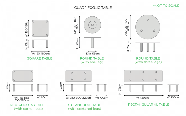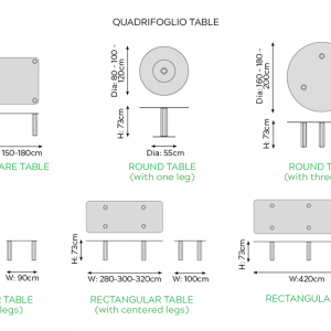 Rectangular – W: 160cm D: 90cm H: 73cm (with corner legs), Rectangular – W: 190cm D: 90cm H: 73cm (with corner legs), Rectangular – W: 210cm D: 90cm H: 73cm (with corner legs), Rectangular – W: 230cm D: 90cm H: 73cm (with corner legs), Rectangular – W: 280cm D: 100cm H: 73cm (with centered legs), Rectangular – W: 300cm D: 100cm H: 73cm (with centered legs), Rectangular – W: 320cm D: 100cm H: 73cm (with centered legs), Rectangular XL – W: 420cm D: 130cm H: 73cm, Round – Dia: 100cm H: 73cm (with one leg), Round – Dia: 120cm H: 73cm (with one leg), Round – Dia: 160cm H: 73cm (with three legs), Round – Dia: 180cm H: 73cm (with three legs), Round – Dia: 200cm H: 73cm (with three legs), Round – Dia: 80cm H: 73cm (with one leg), Square – W: 150cm D: 150cm H: 73cm, Square – W: 180cm D: 180cm H: 73cm
