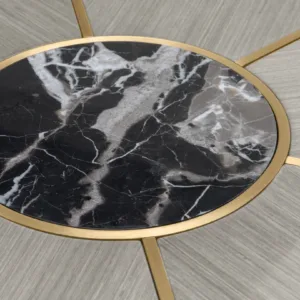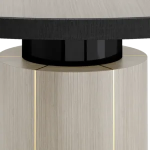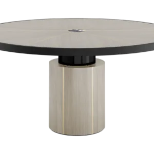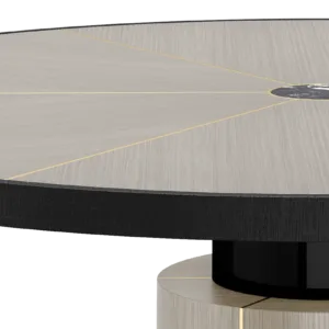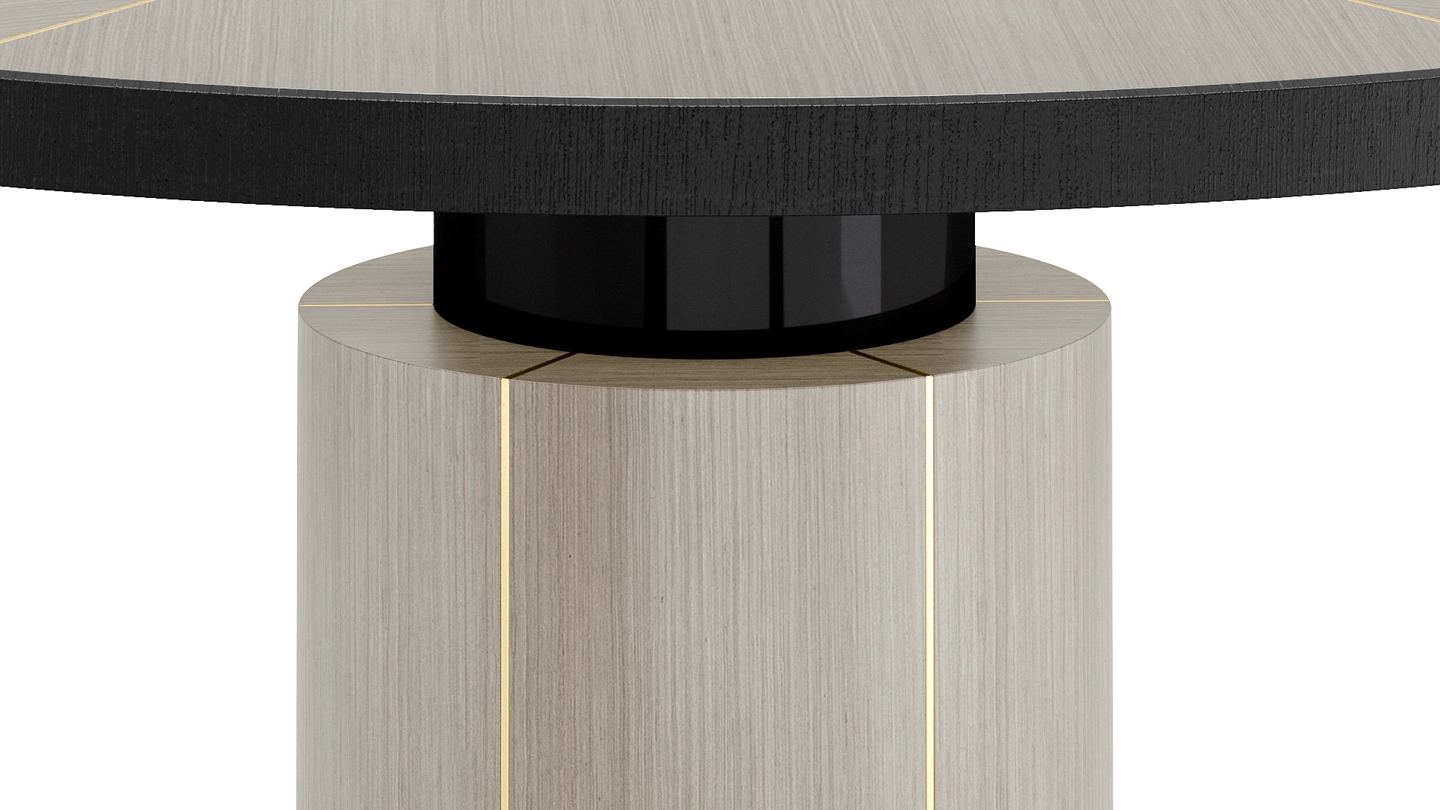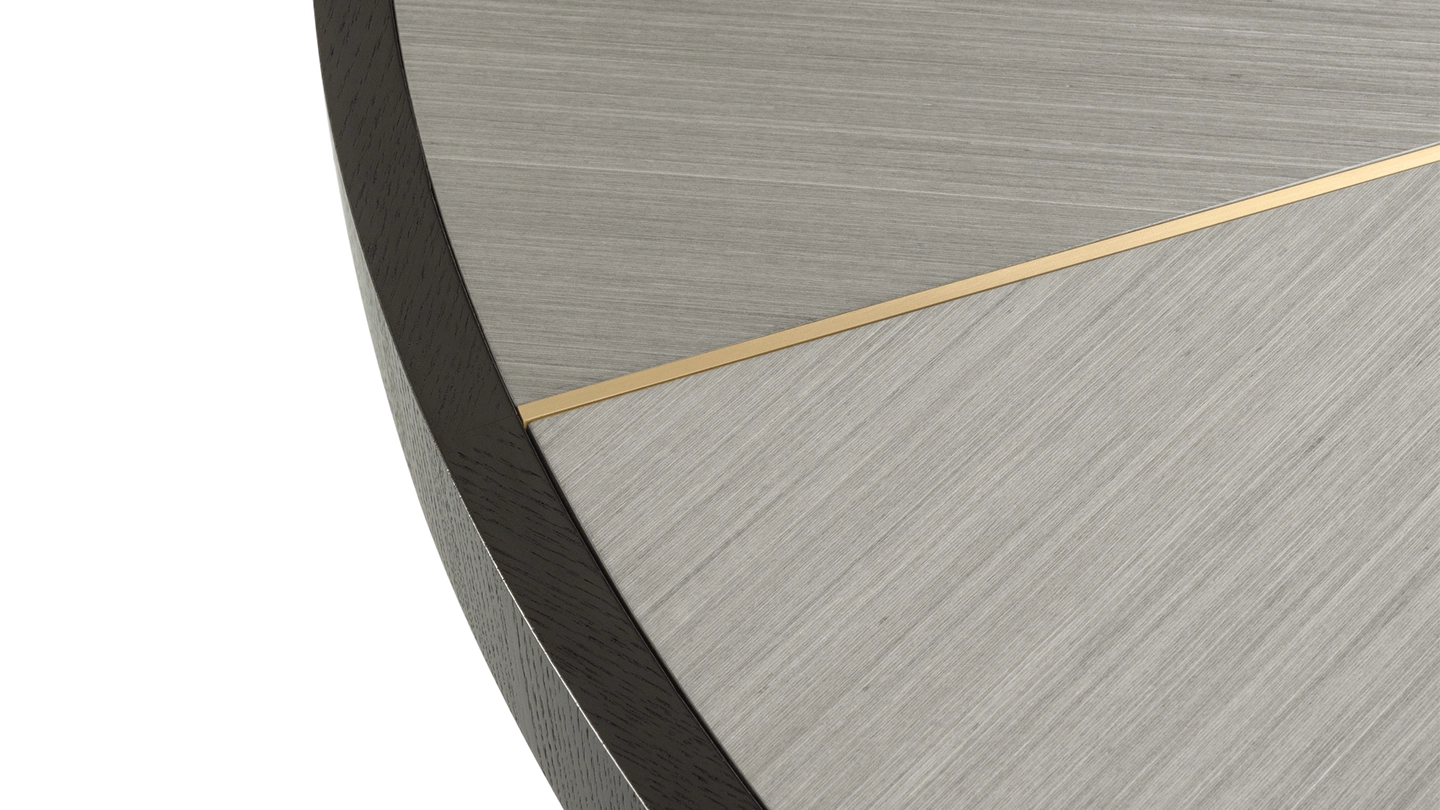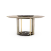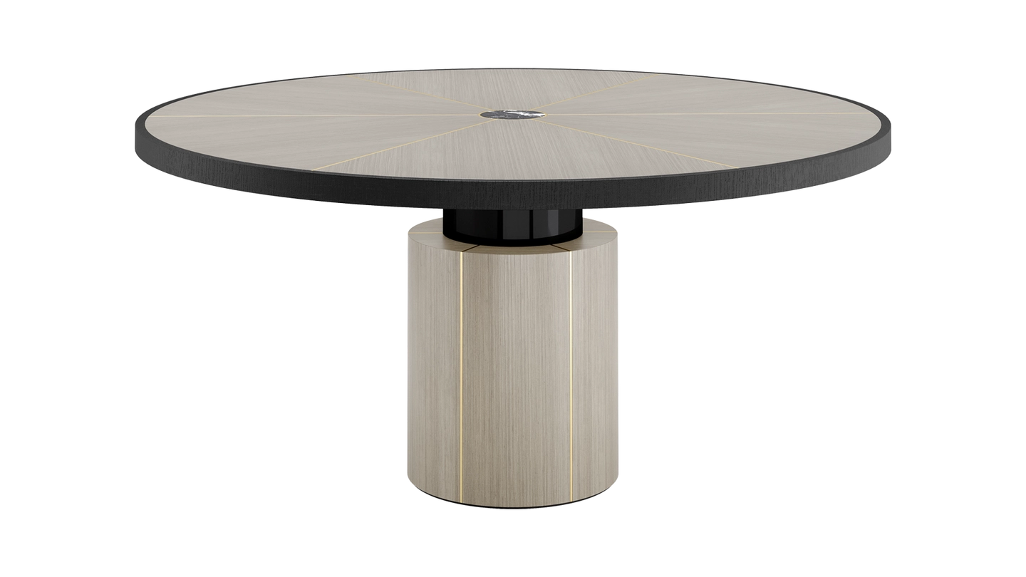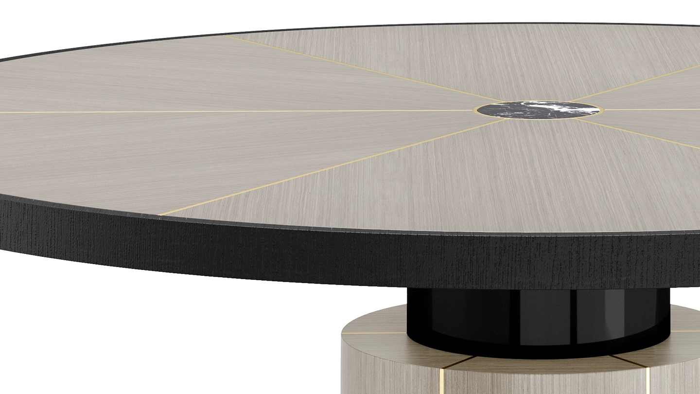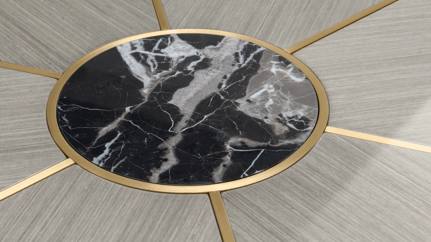“Blending a stone centre with seams of brushed brass and sections of wood veneer, the surface of the RAIPUR Dining Table brings a touch of the extraordinary to everyday dining. ”