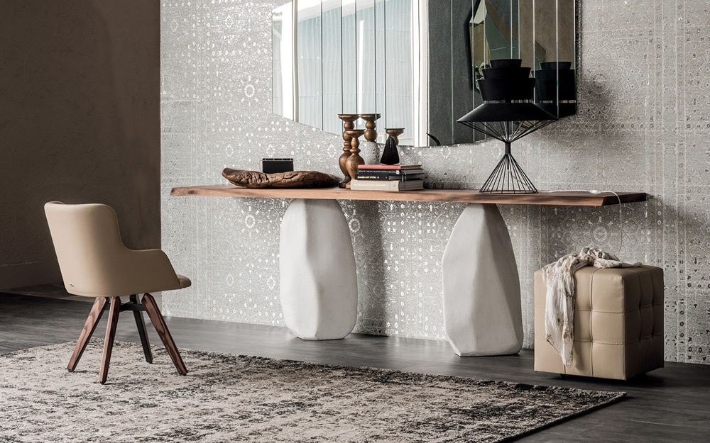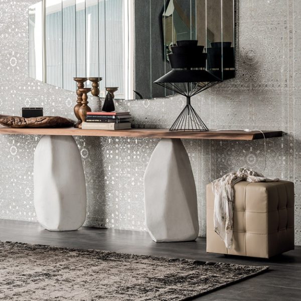 The Rapa Nui is a striking console table with a stone style base in white or grey cement. The top is available in a selection of wood finishes with a natural irregular front edge. Available in a choice of sizes.