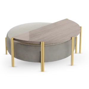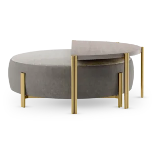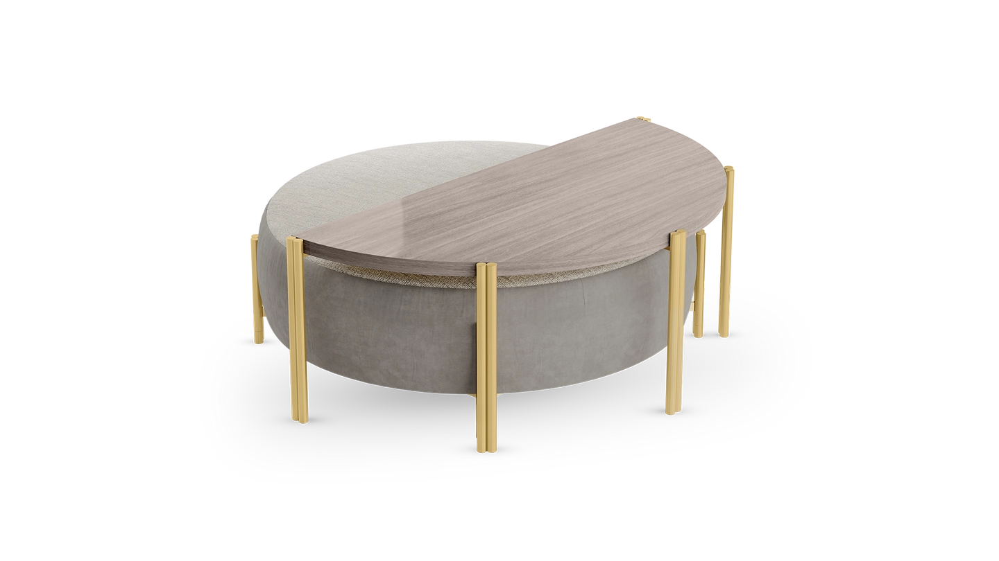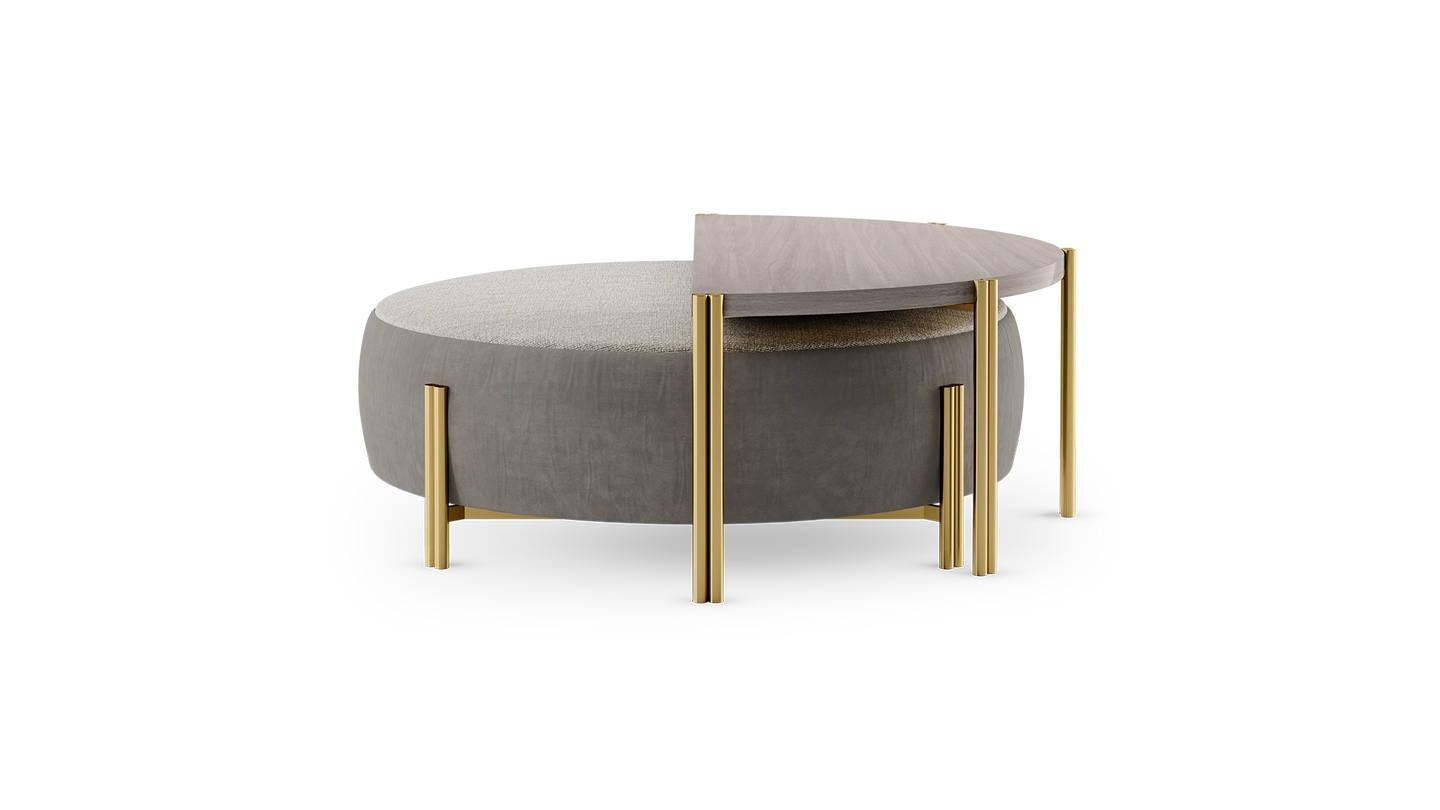 The RECIFE coffee table brings together two distinct pieces. A semi-circular coffee table in wood veneer overlaps a rounded upholstered stool, while pairs of metal tubular legs across both elements bring a sense of synchronisation to the whole.