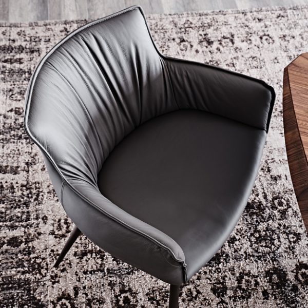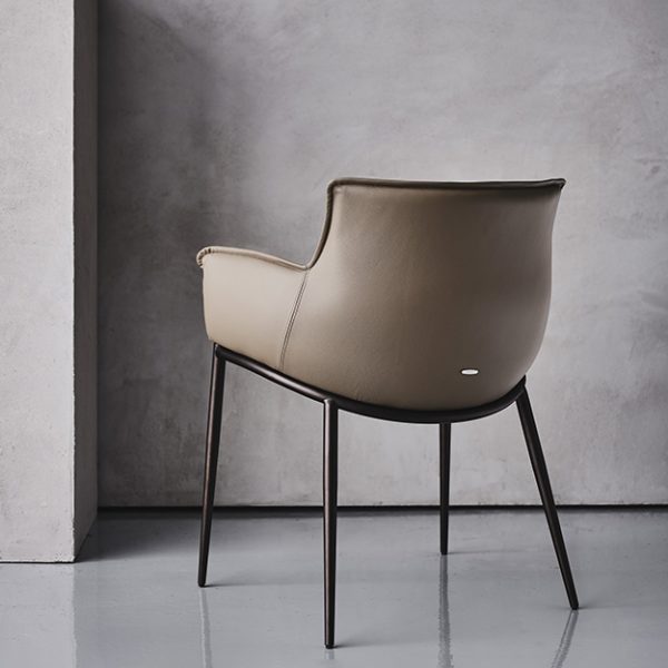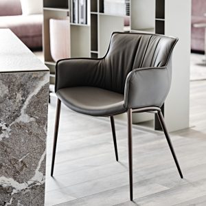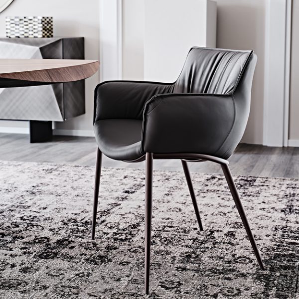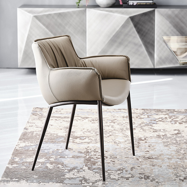 The Rhonda chair by Cattelan Italia is a stylish, unique design featuring a rounded metal frame that supports a padded leather seat, backrest and armrests with a subtle curve for added comfort. The upholstered seat and frame are both available in a range of finishes for a bespoke look.