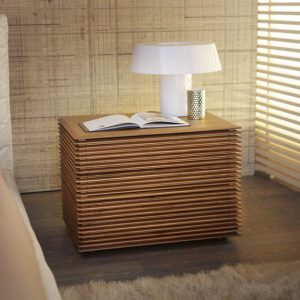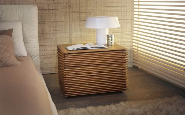 The Riga two-drawer bedside table by Porada features a distinctive layered wood-effect design. The design can be crafted in a selection of Canaletto Walnut and Matt Lacquered finishes.