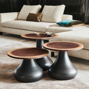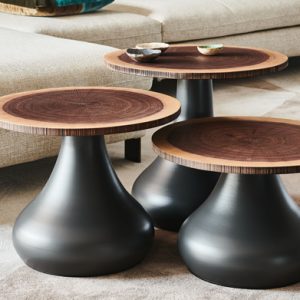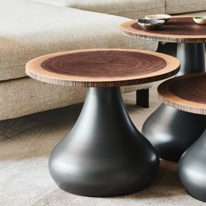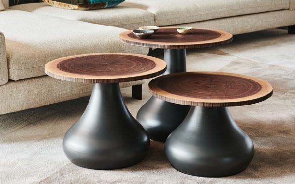 A striking coffee table with a bulbous base in graphite lacquered aluminium, the Rio features a veneered walnut top from the log section of tree trunk. Approximate sizes of the top are presented as each piece will be unique and different in shape and size.