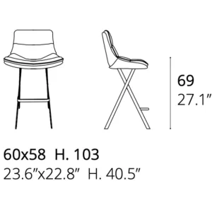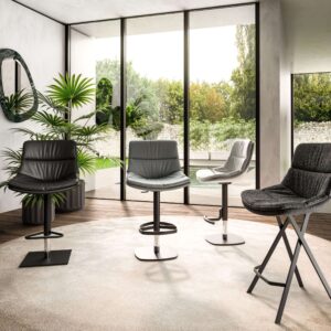Fixed stool with metal base. Fully upholstered chair in various finishes.