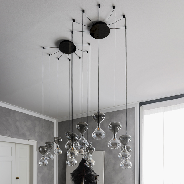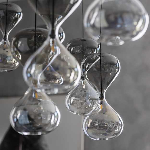 The Sablier Suspension Cluster light features a collection of hour glass-shaped diffusers, available in either a clear or mixed clear/ smoked glass finish. This light features G4 LED light fittings. Bulbs included.