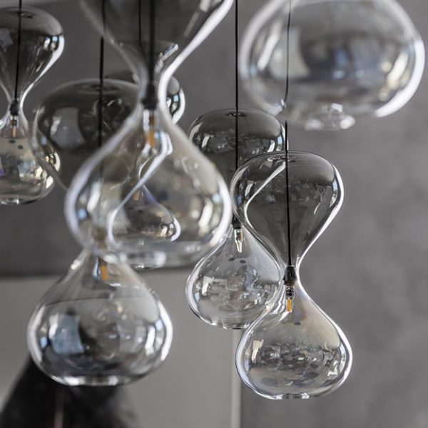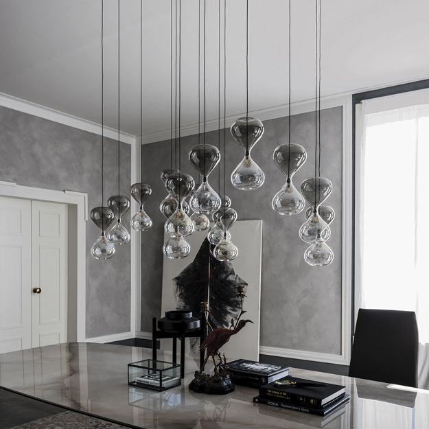 The Sablier Suspension Light features a single hour glass-shaped diffuser in either a Clear or Mixed Clear/ Smoked Glass finish with a round ceiling rose in Black Chrome Steel.  Purchase each suspension light individually in order to style as preferred over a bar area or dining table.
