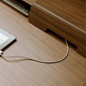 Classic writing desk in solid Canaletto Walnut with a central drawer, shelf and lifting compartments for concealing cables. The Saffo is accompanied by a Cuoietto Hide Leather Desk Pad, available in a selection of colour options.
