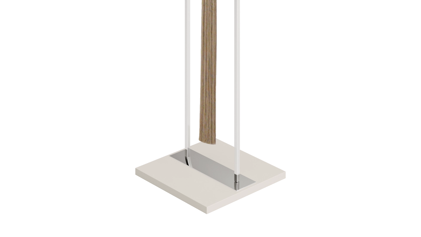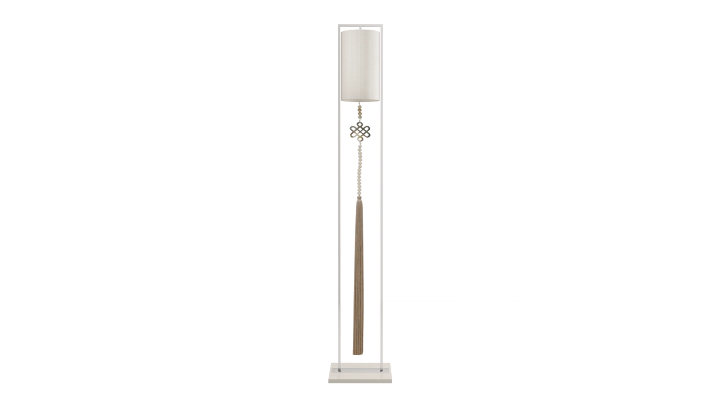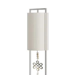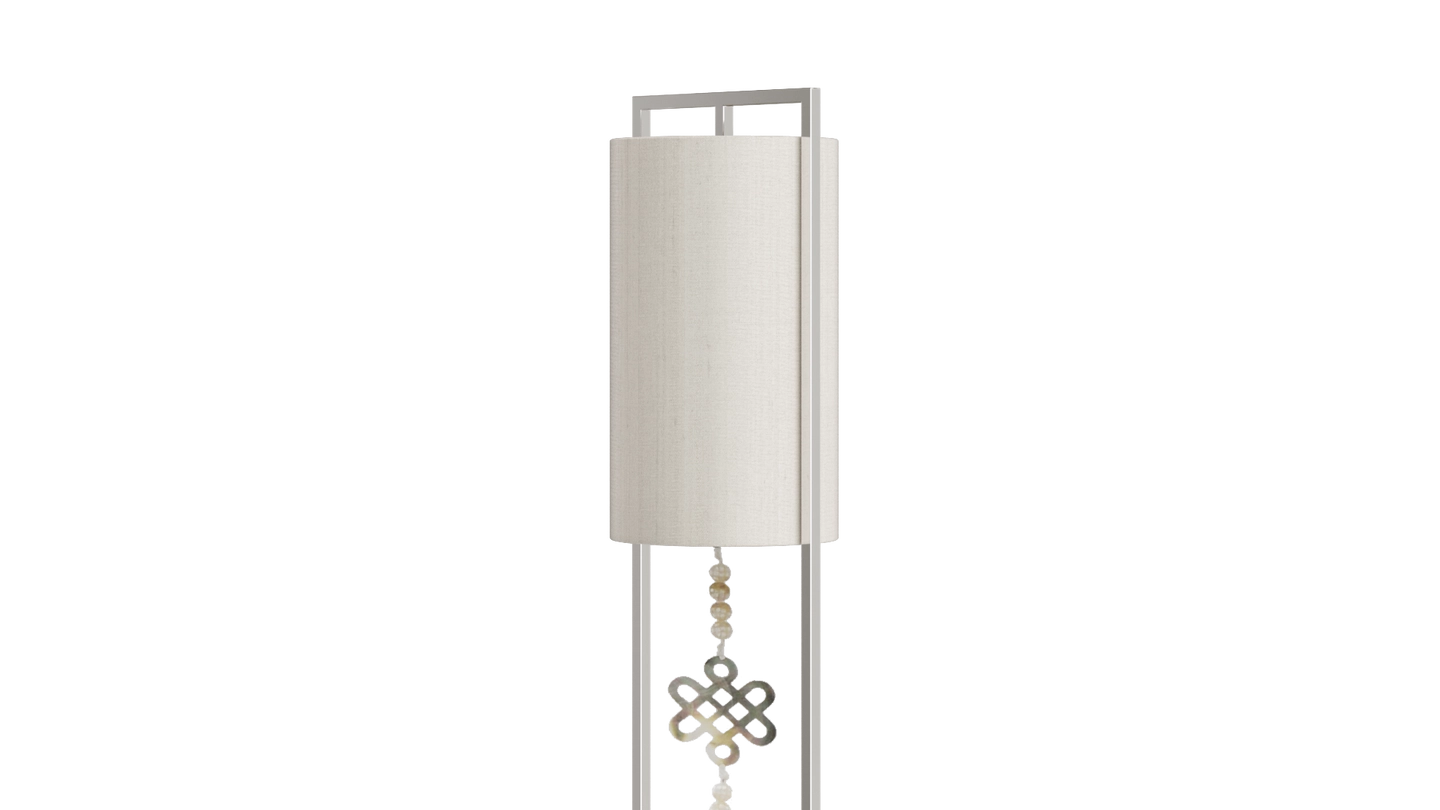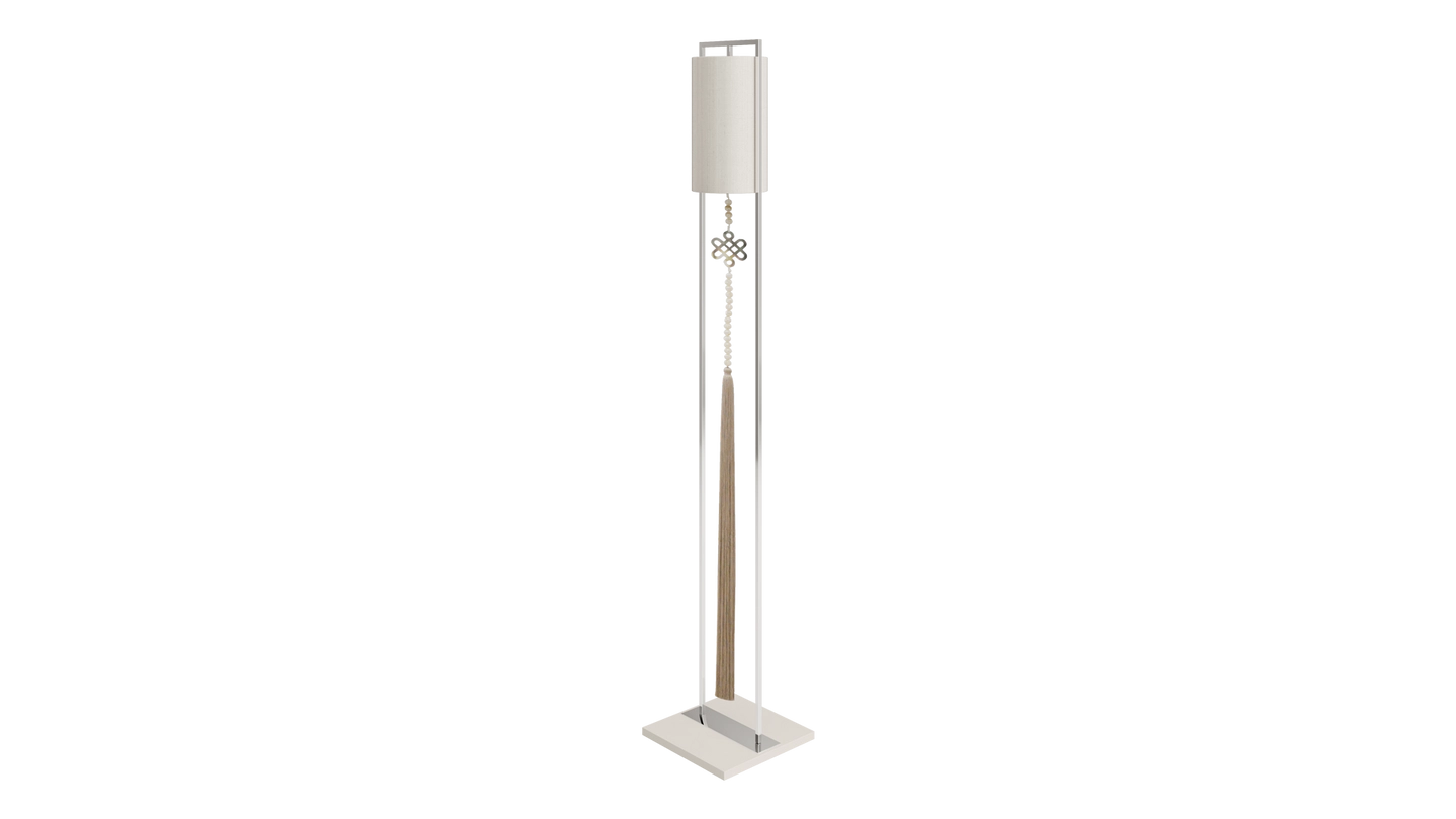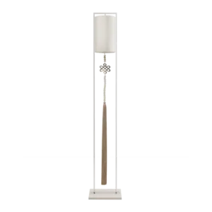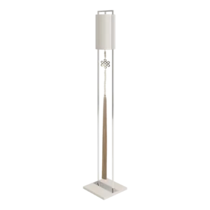 Not just for illumination, the gracious SAGRES floor lamp will add height and elegance to your space. Its base of lacquered wood anchors a slim frame of polished stainless-steel, from which is suspended a double-silk shade and an ornamental pendant.