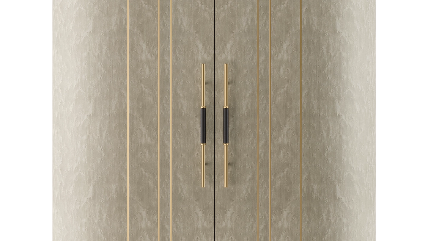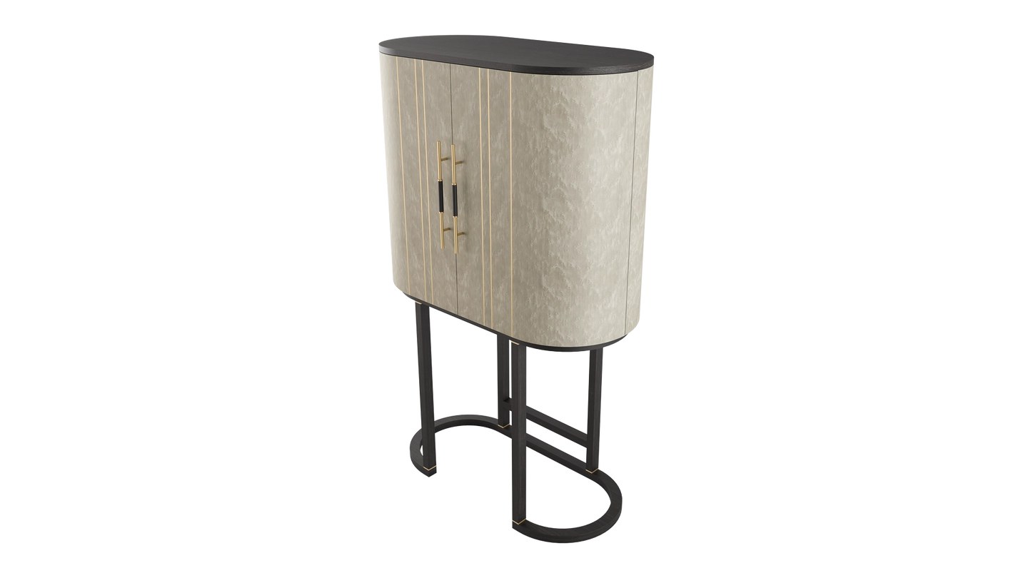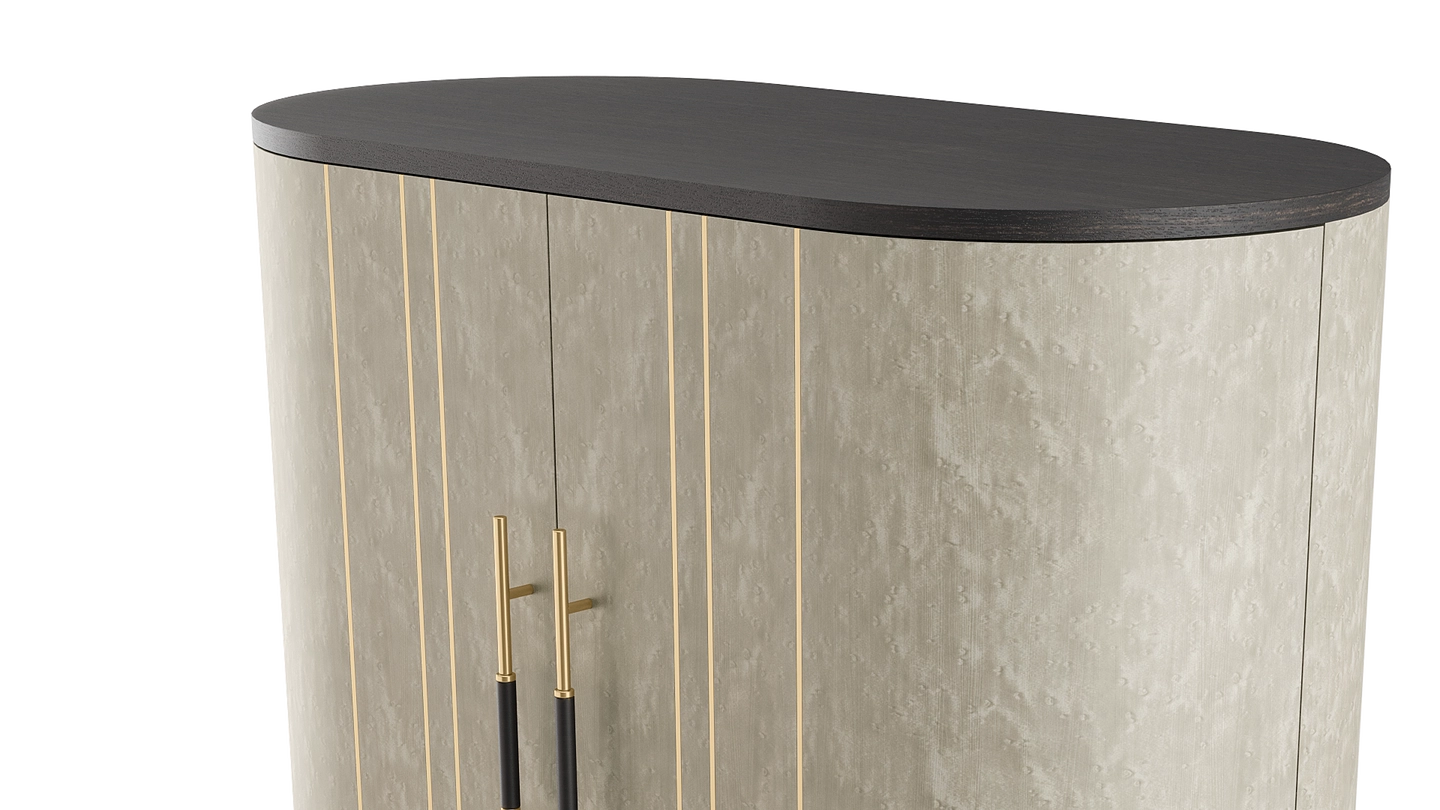 A graceful elliptical shape, the SALAMANCA tall cabinet mesmerises with its curves. A blend of dramatic dark and cloudy, grey-toned wood veneer, the design’s double door fronts feature horizontal brushed-brass details that echo the linear form of the handles.