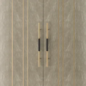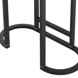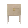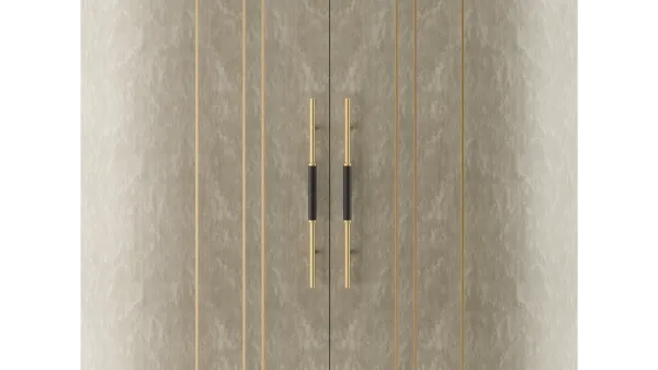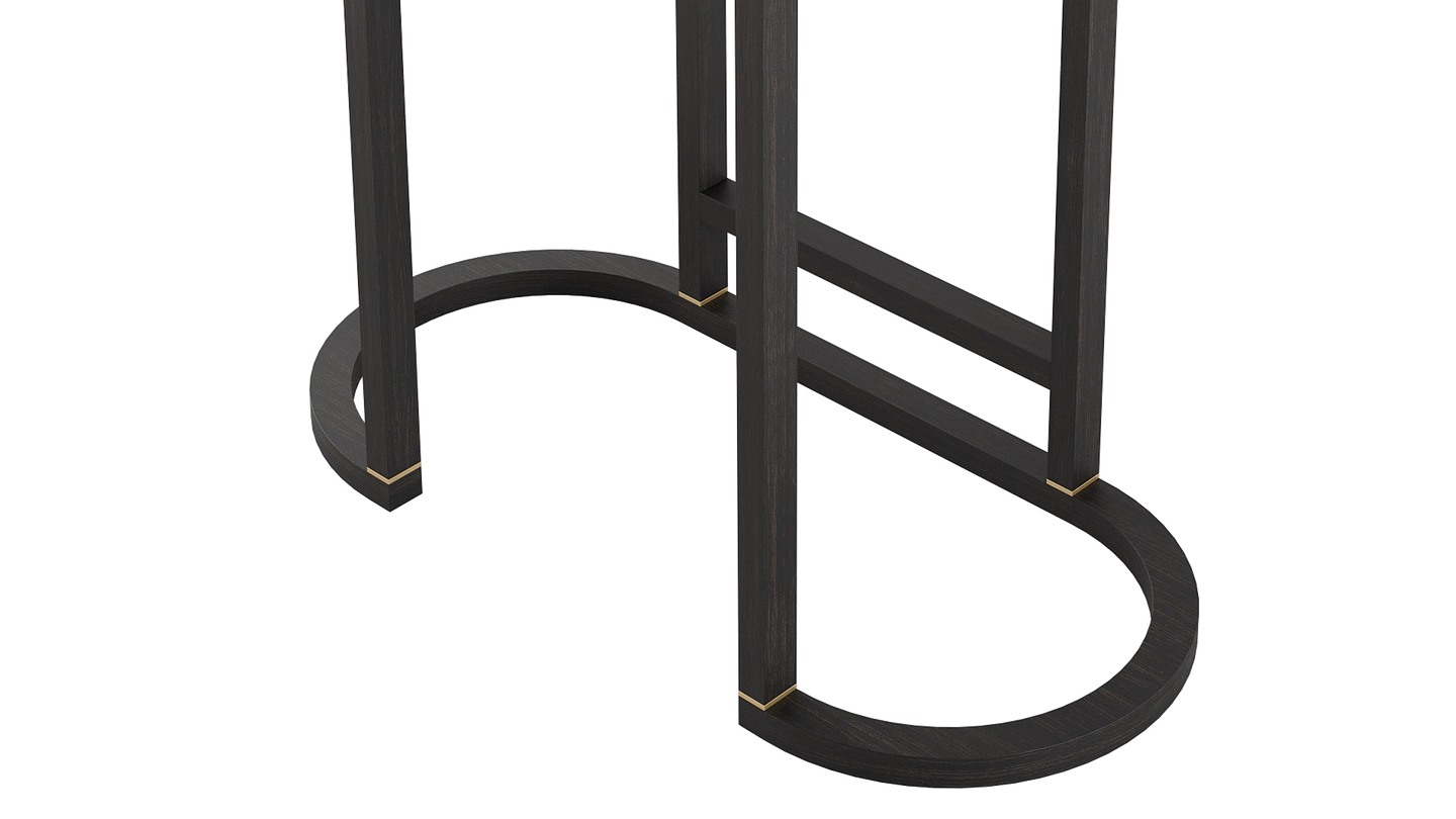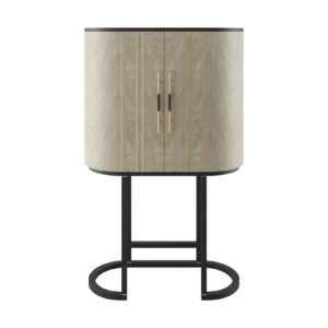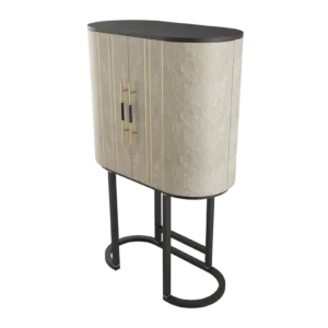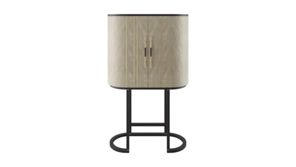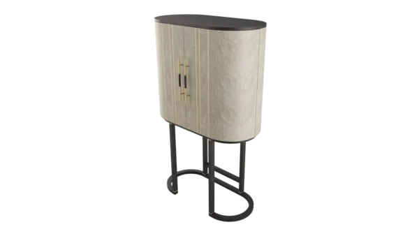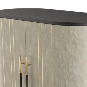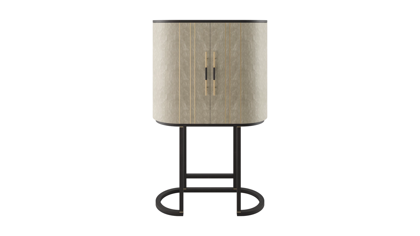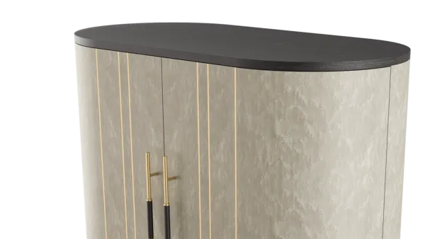 A graceful elliptical shape, the SALAMANCA tall cabinet mesmerises with its curves. A blend of dramatic dark and cloudy, grey-toned wood veneer, the design’s double door fronts feature horizontal brushed-brass details that echo the linear form of the handles.