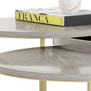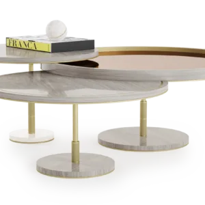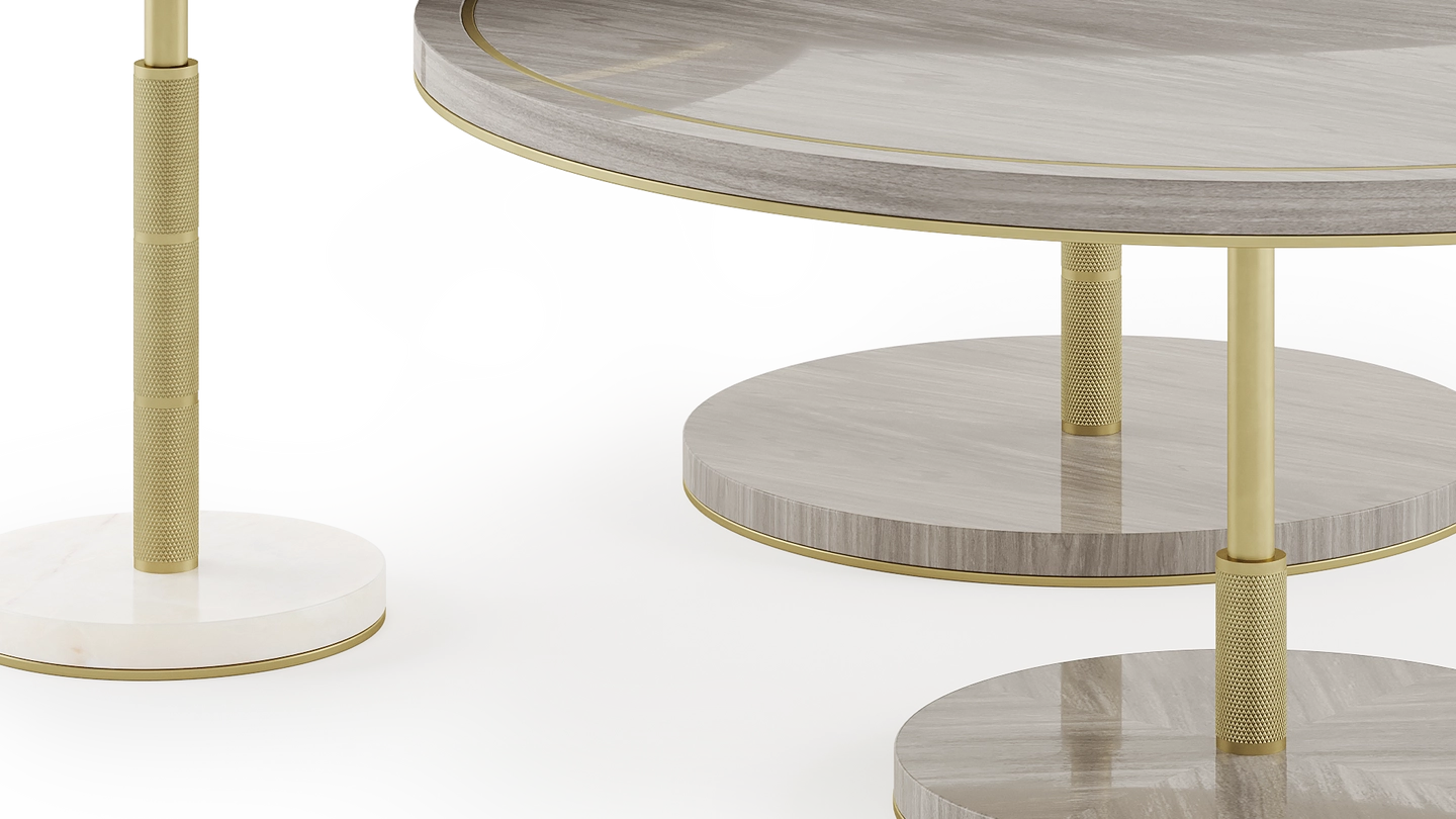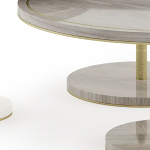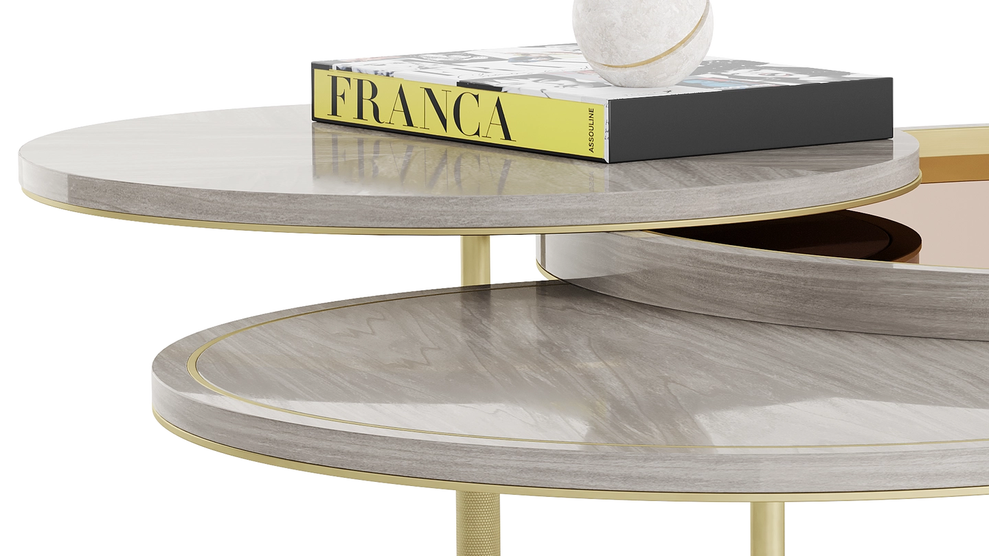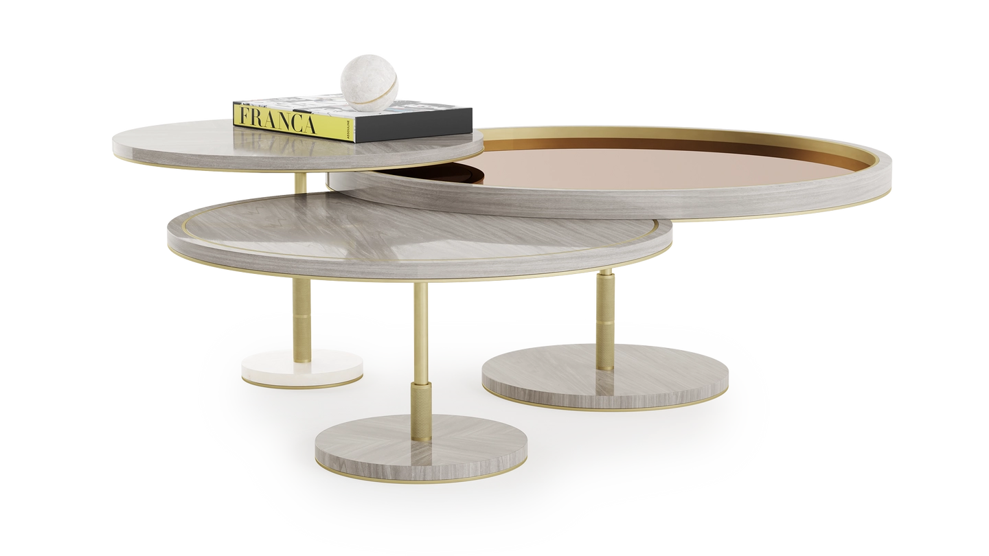 The distinctive SEATTLE Coffee Table incorporates three different volumes that casually overlap, providing a multitiered surface space. Crafted from a palette of glossy wood veneer, stone, brushed brass and bronze mirror, this piece is a simple way to introduce mixed materials to a living space.