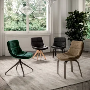 A family of armchairs with a soft and cosy seat, presented with different covers. The seams on the backrest design the shapes and let the softness shine through. Different bases, both in design and material, offer multiple possibilities of combinations to satisfy every environment and circumstance.