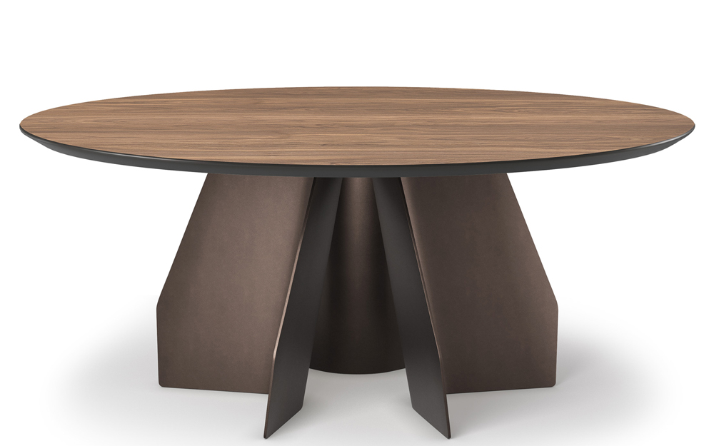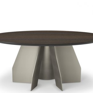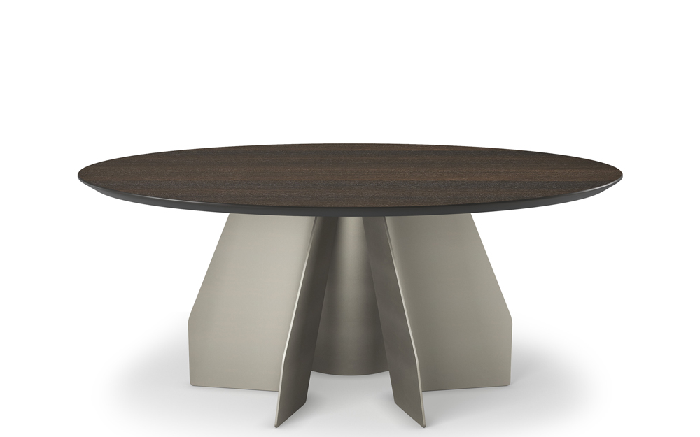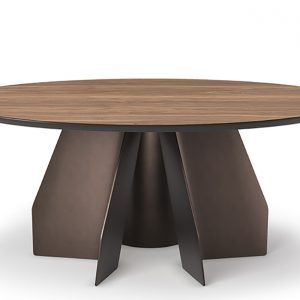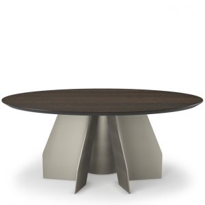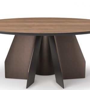 The Senator Round table by Cattelan Italia is characterised by a statement geometric central metal base formed from three curved sections of embossed lacquered steel in a circular arrangement. This supports a round solid wood top with gently bevelled edges.