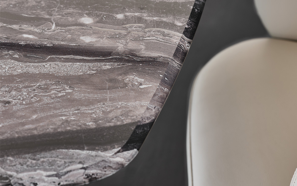 This is supported by two bold asymmetrical metal bases in a choice of embossed lacquered steel finishes.