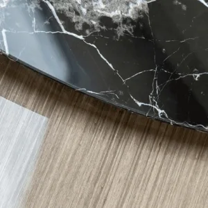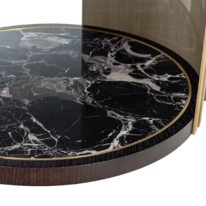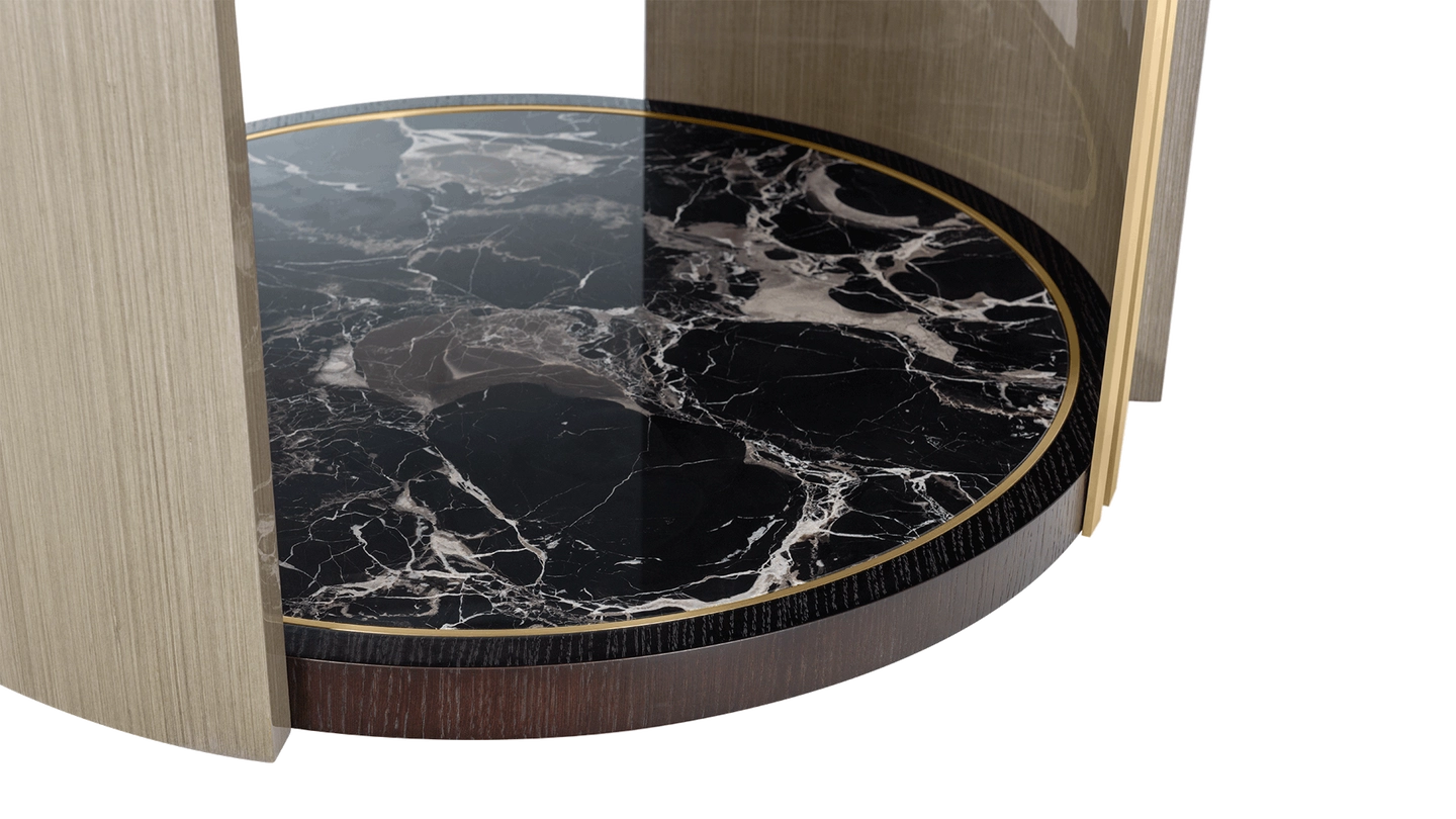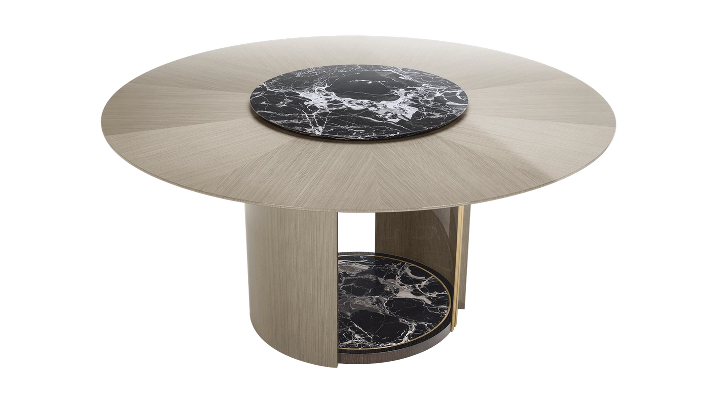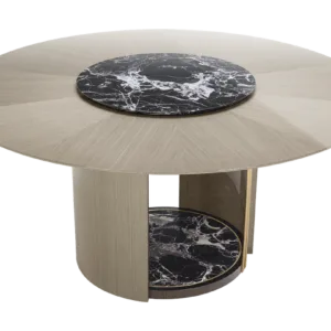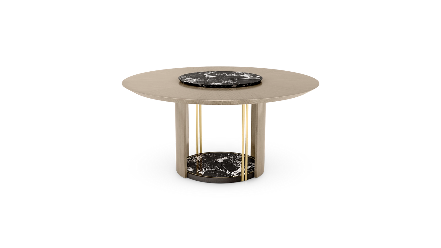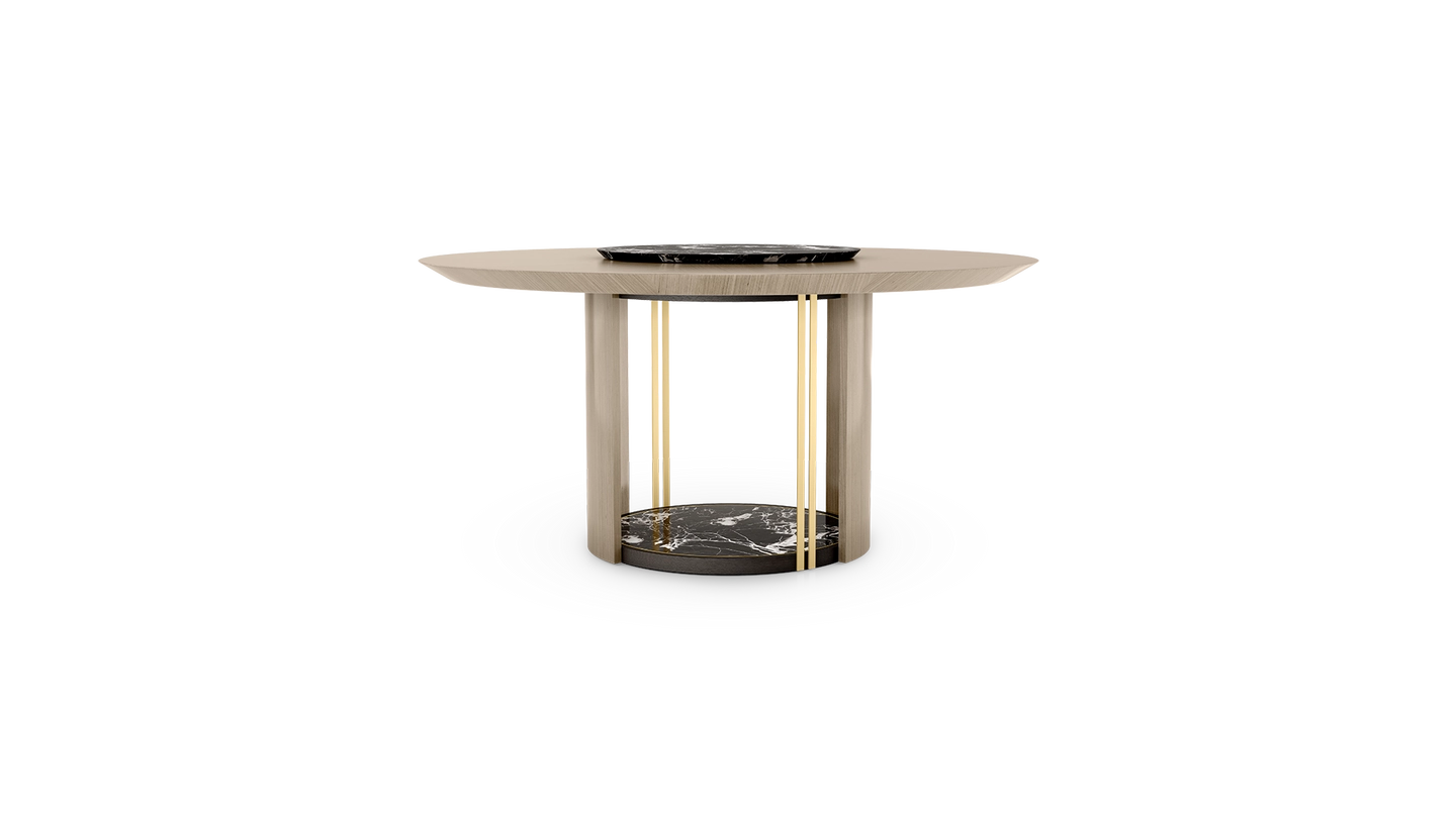 Crafted from wood veneer, the graceful SENDAI dining table features a stone centrepiece that is actually a rotating tray, introduced to make the serving and sharing of food effortless. This stone circle is then repeated at the base, which is further enlivened with details of brushed brass.