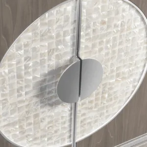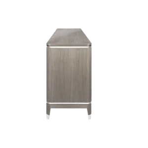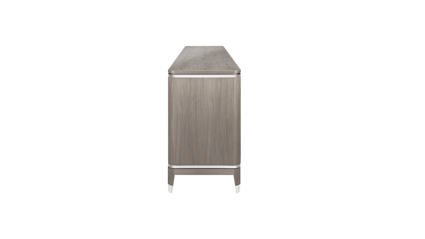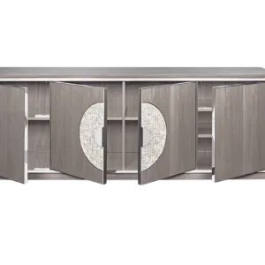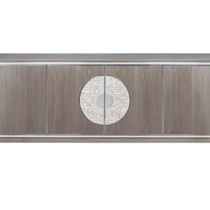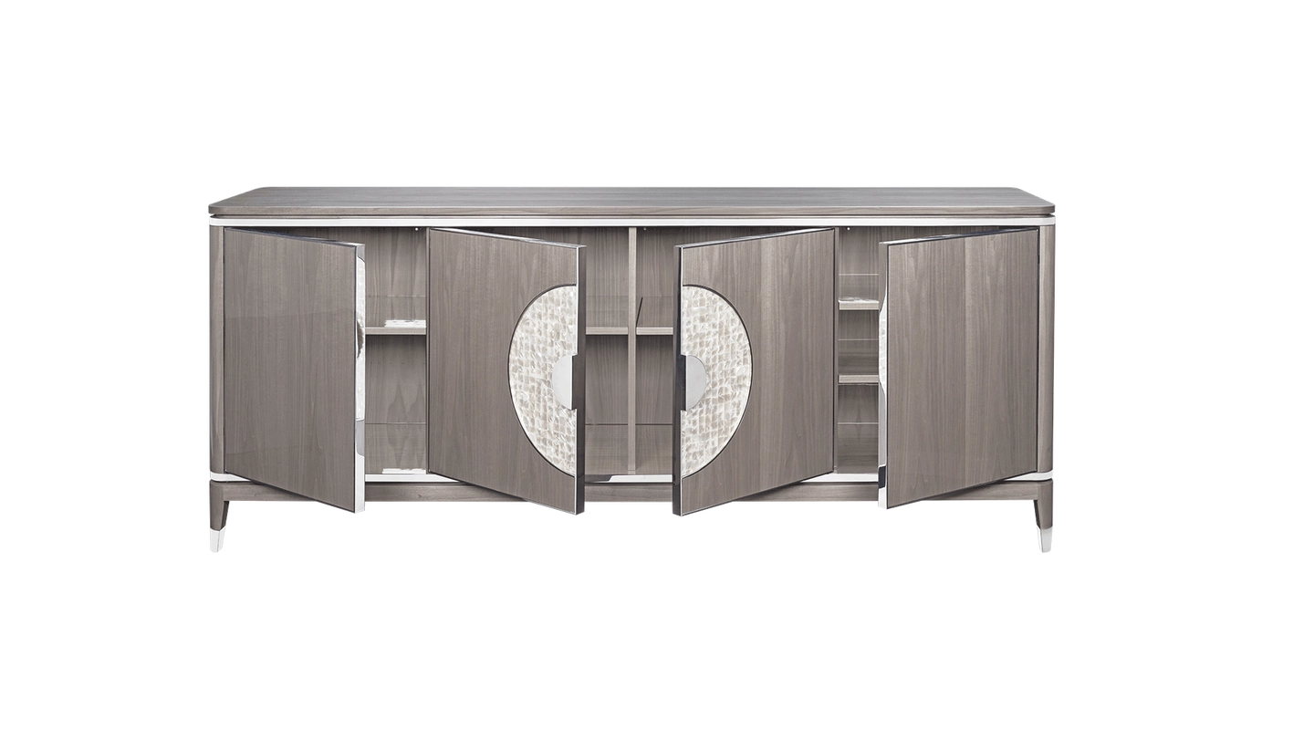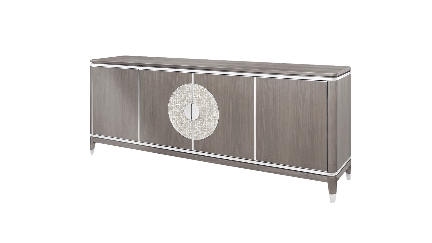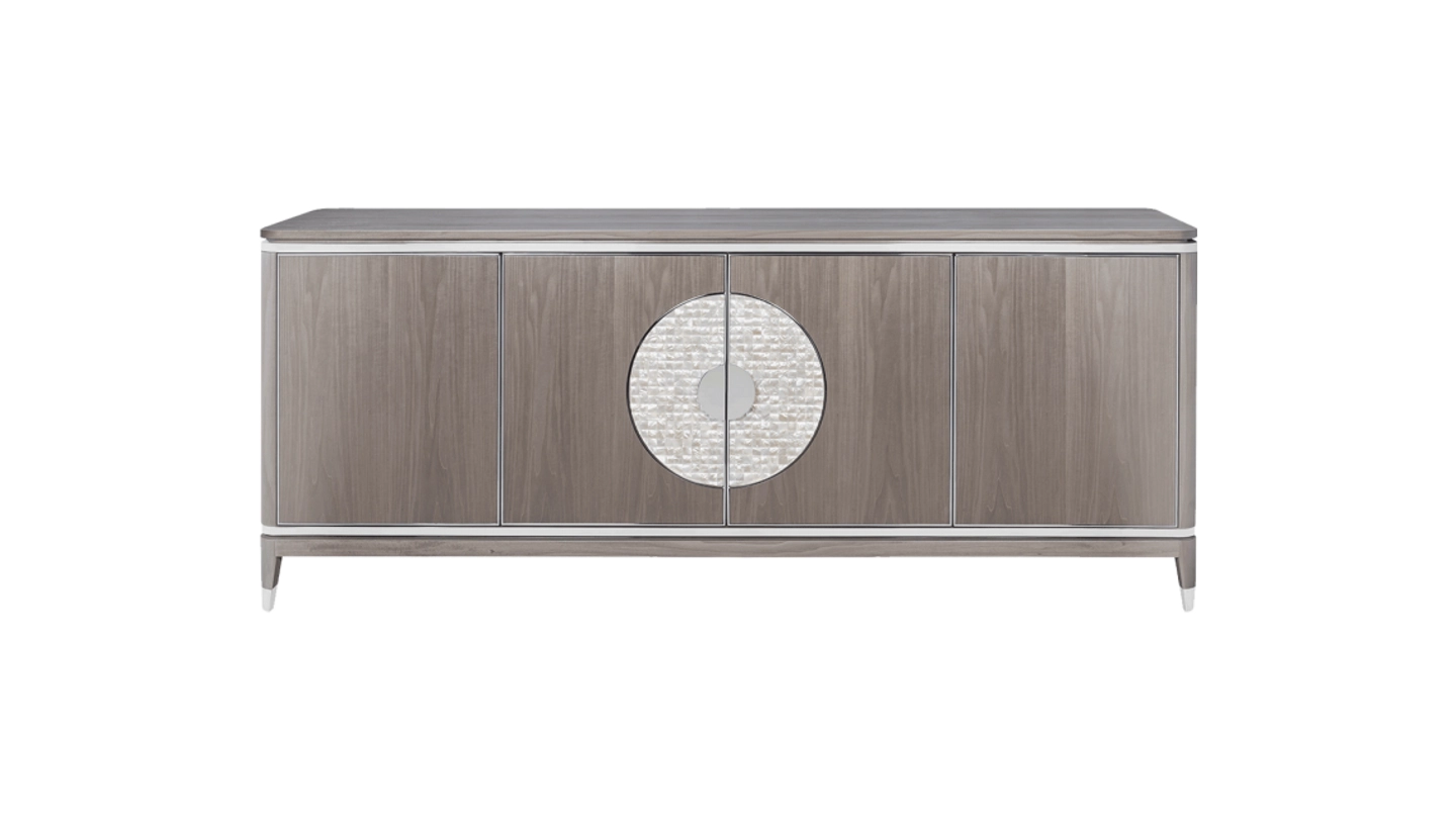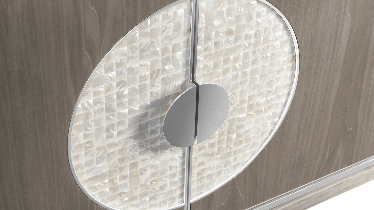 The striking SEVILLE sideboard uses elegant materials to elevate a pared-back silhouette. Crafted from glossy wood veneer, details of brushed brass and a circular inlay of white mother of pearl catch the light and the eye.